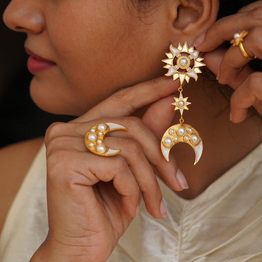 Step into the celestial realm with the breathtaking beauty of the wonders of the universe reflected in our stunning new Vishwa collection. A dreamy line of festive pieces perfect for the wedding season or a special occasion, the all new Vishwa features ivory enamel and faux pearls and radiates femininity in the most delicate yet opulent way. Get ready to feel like a celestial goddess this festive season.