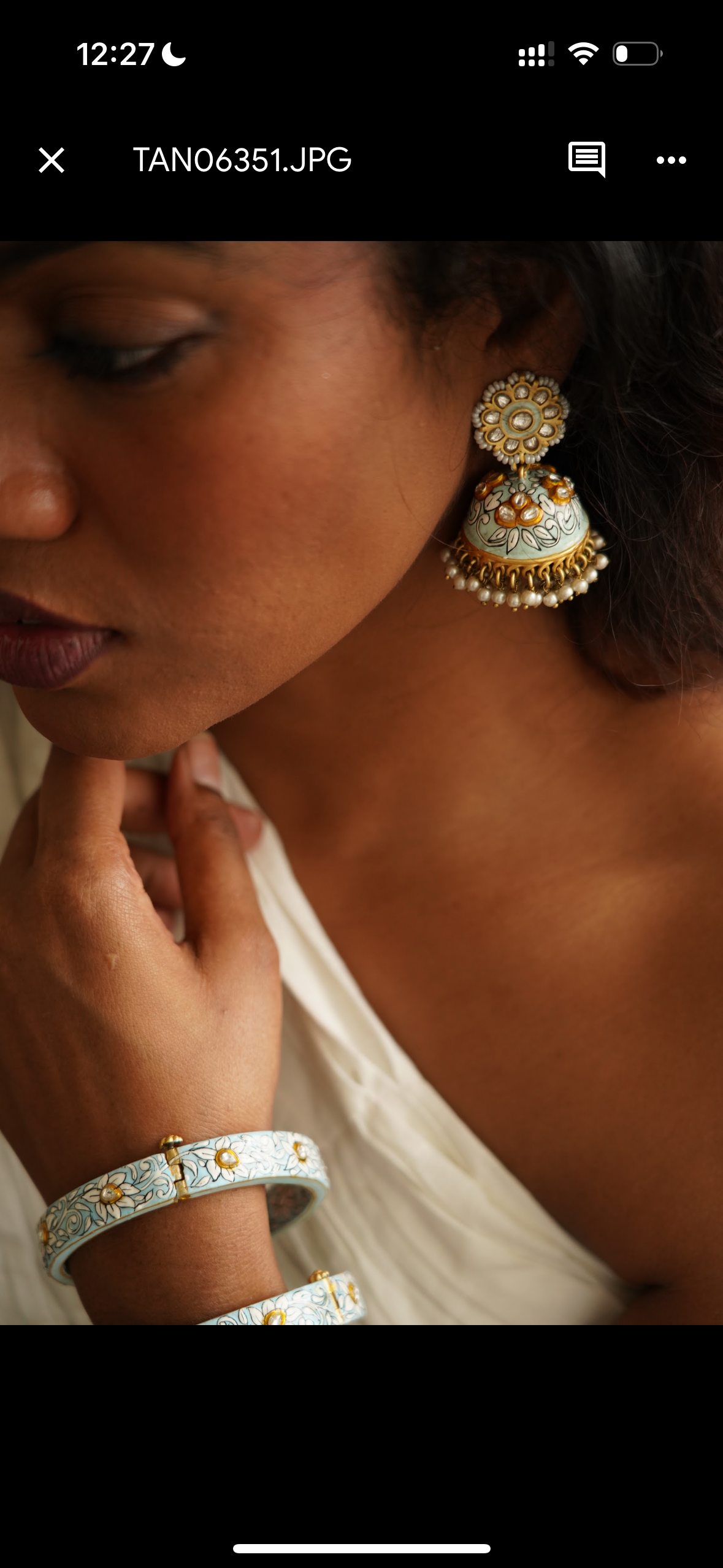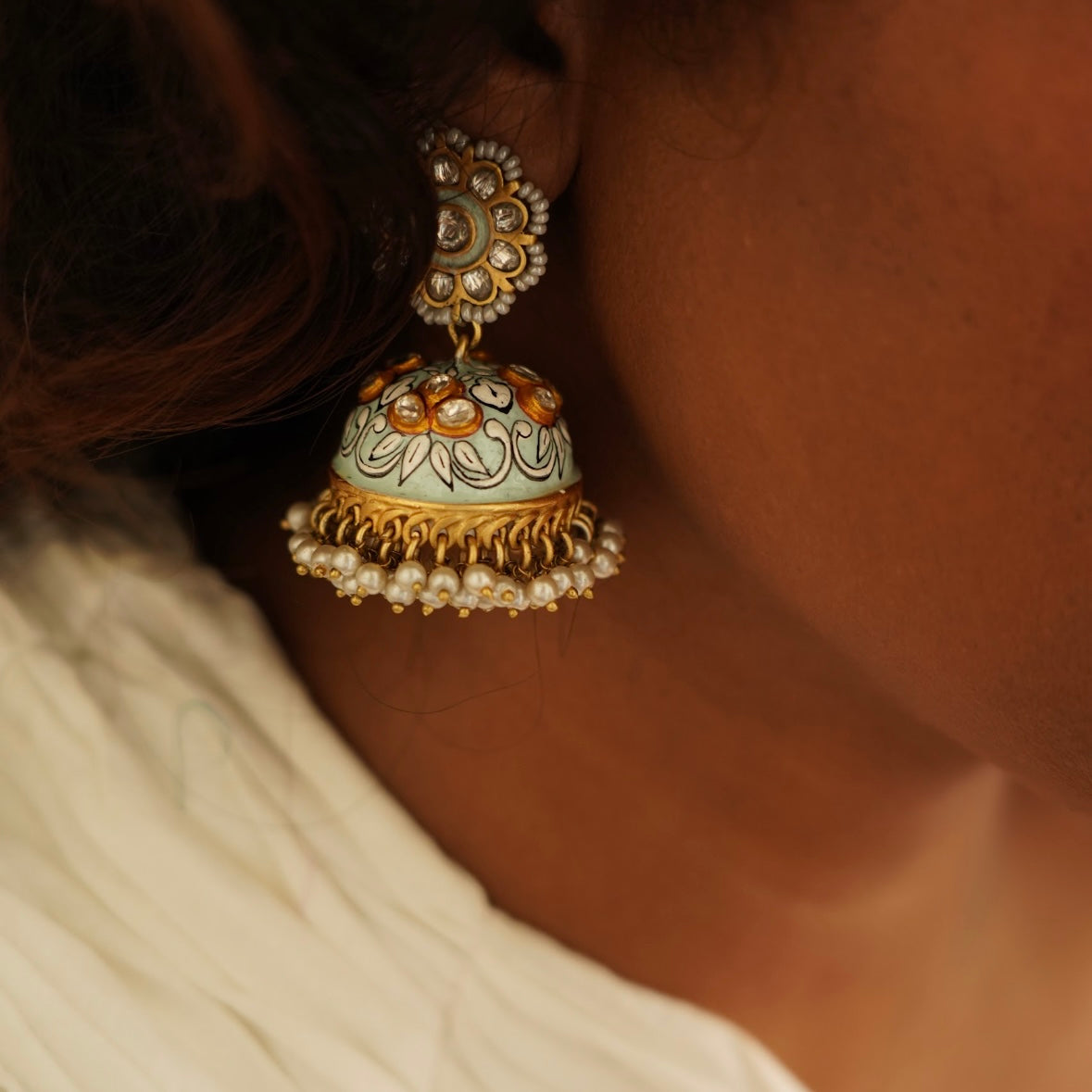 These aqua-colored jhumkas showcases exquisite meenakari work, featuring a unique openable design for ease of wear. Adorned with sparkling glass polkis, it combines traditional craftsmanship with contemporary style, making it a standout accessory for any occasion.