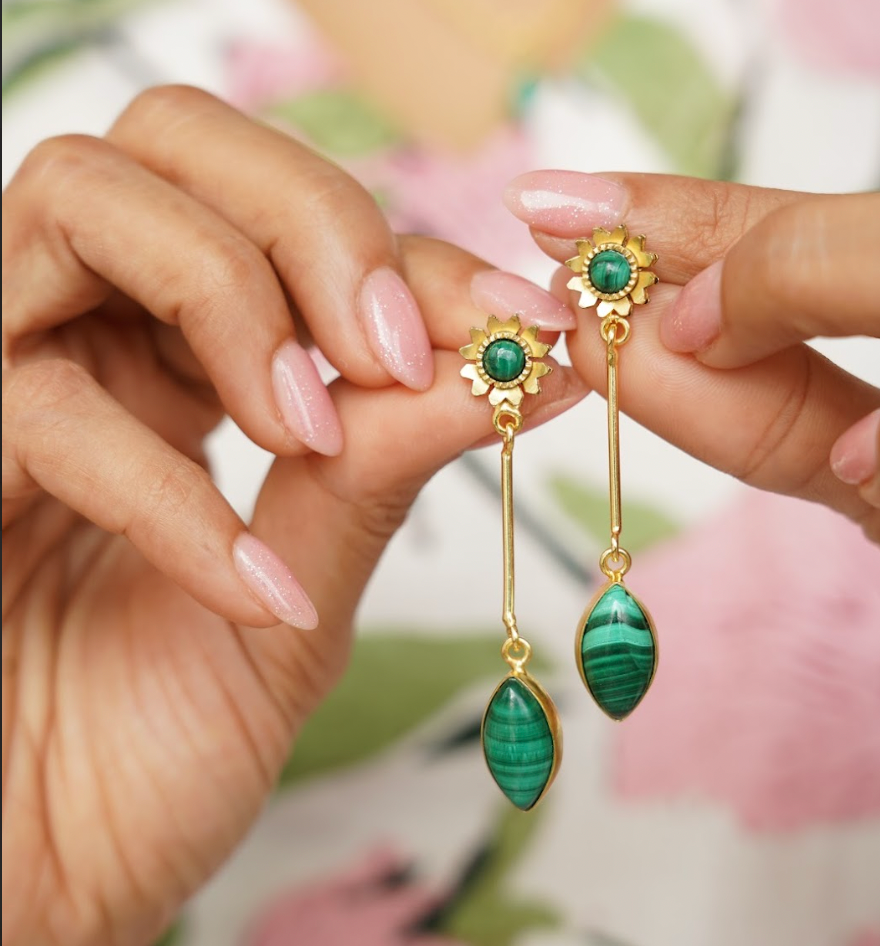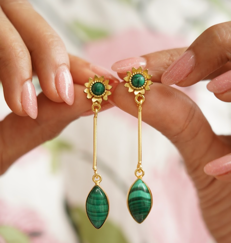 Elevate your elegance with the Aranya Drop Earrings, featuring minimalist malachite marquis stones. These earrings blend refined simplicity with the unique green hues of malachite, offering a sophisticated touch to any outfit. Expertly crafted for a lightweight, comfortable fit, they make a subtle yet striking statement for both everyday wear and special occasions.