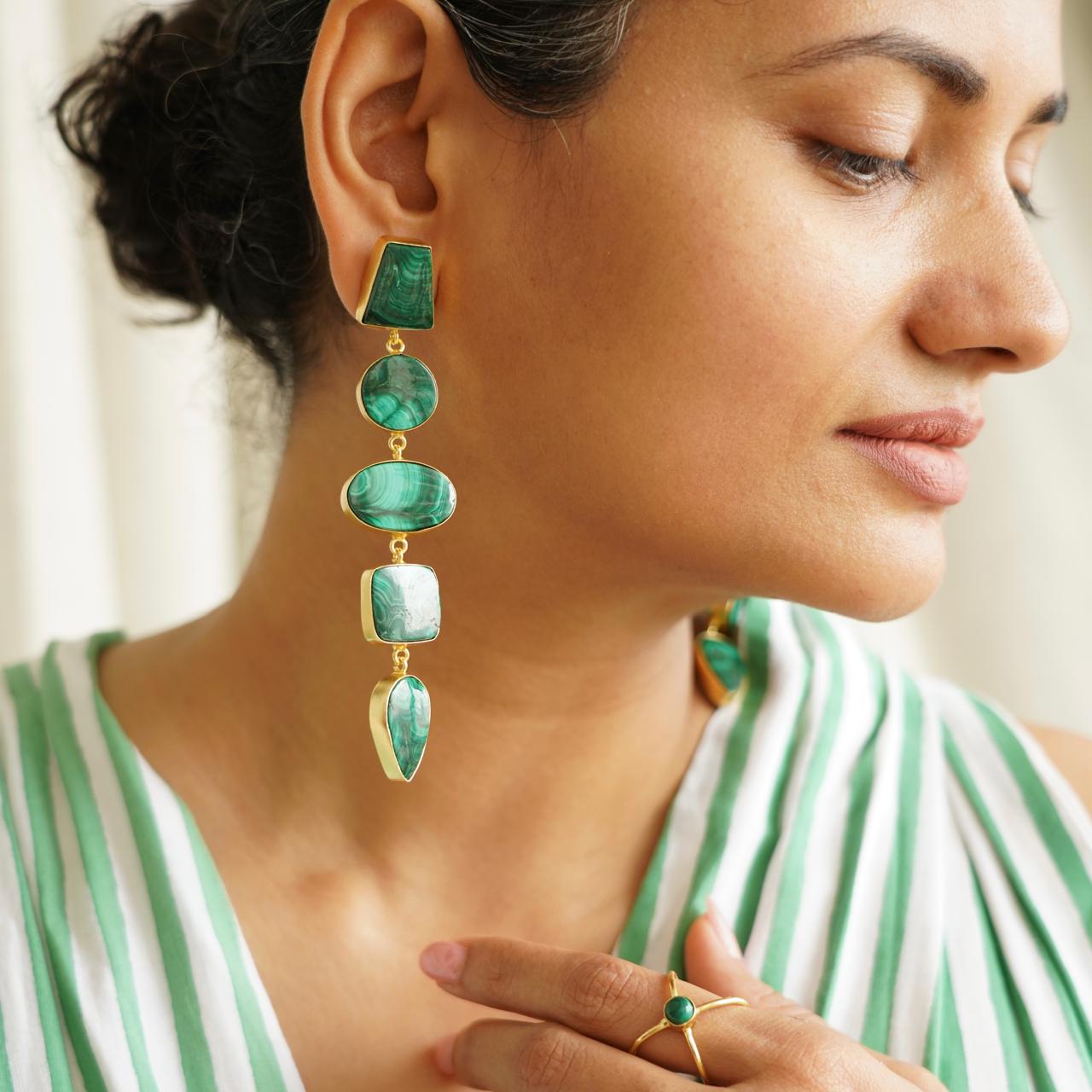 The Aranya Statement Earrings feature one-of-a-kind natural malachite stones, each showcasing unique swirling green patterns. Expertly crafted to highlight the stone’s rich color and texture, these earrings offer a distinctive statement of elegance and individuality. Lightweight and refined, they are perfect for those seeking exclusive, artisan jewelry that stands out with natural beauty.