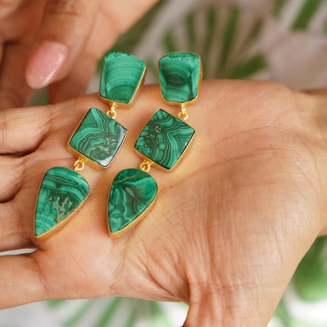 The Aranya Statement Earrings feature one-of-a-kind natural malachite stones, each showcasing unique swirling green patterns. Expertly crafted to highlight the stone’s rich color and texture, these earrings offer a distinctive statement of elegance and individuality. Lightweight and refined, they are perfect for those seeking exclusive, artisan jewelry that stands out with natural beauty.