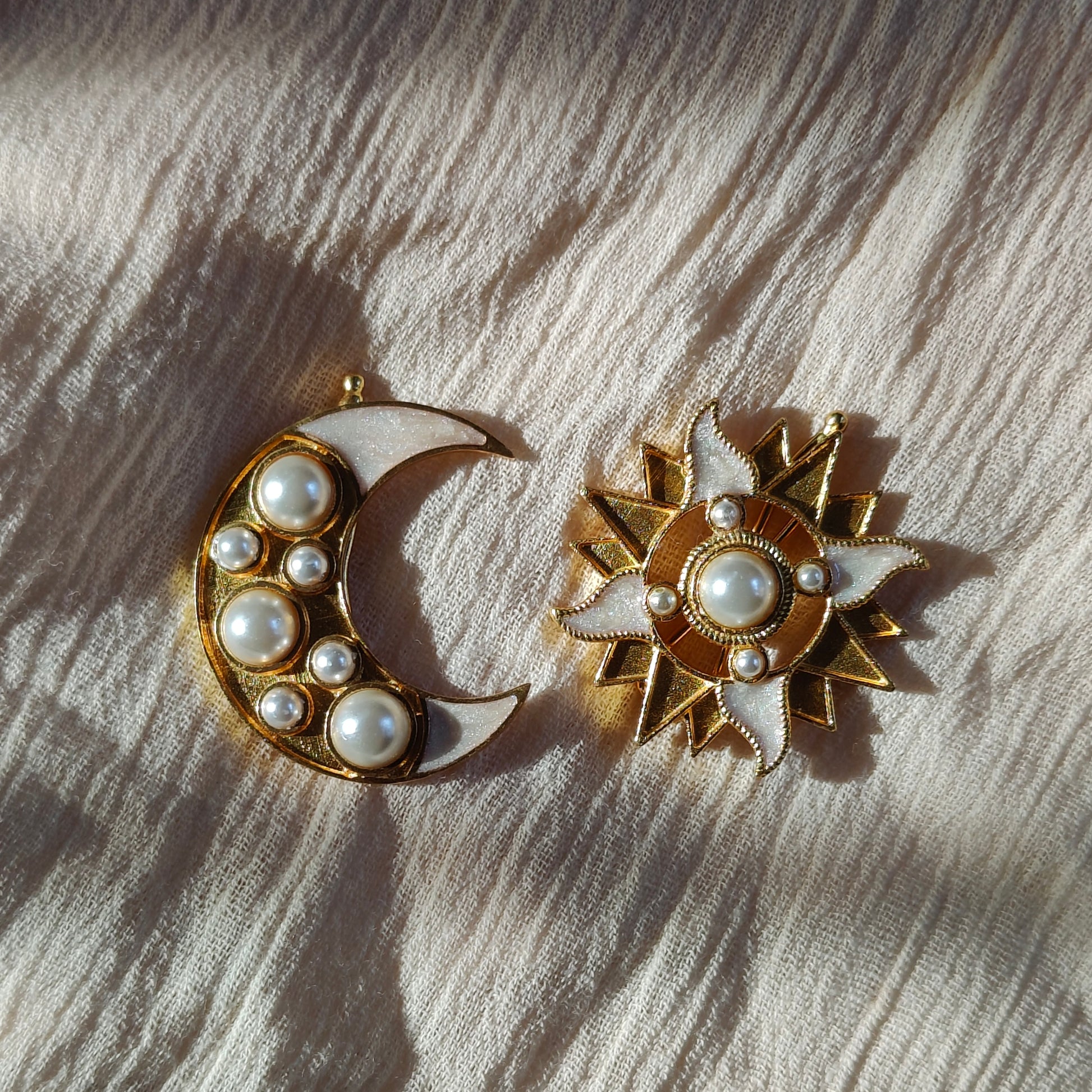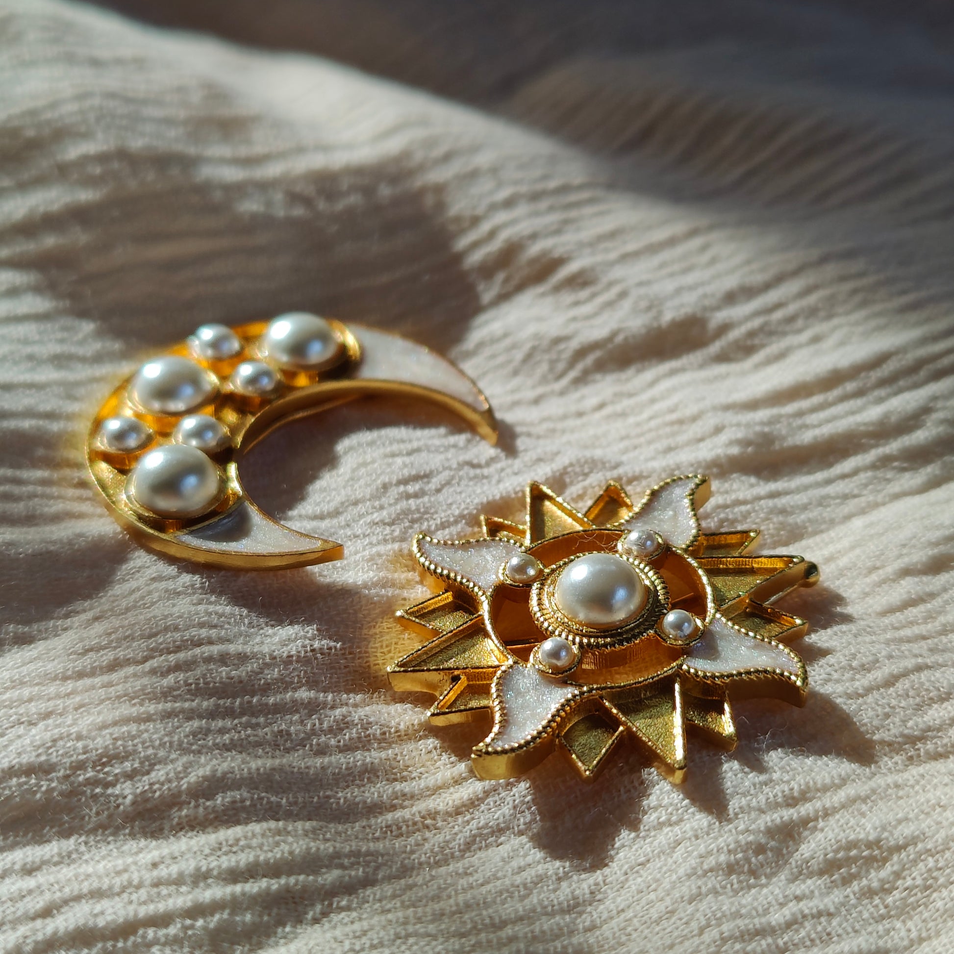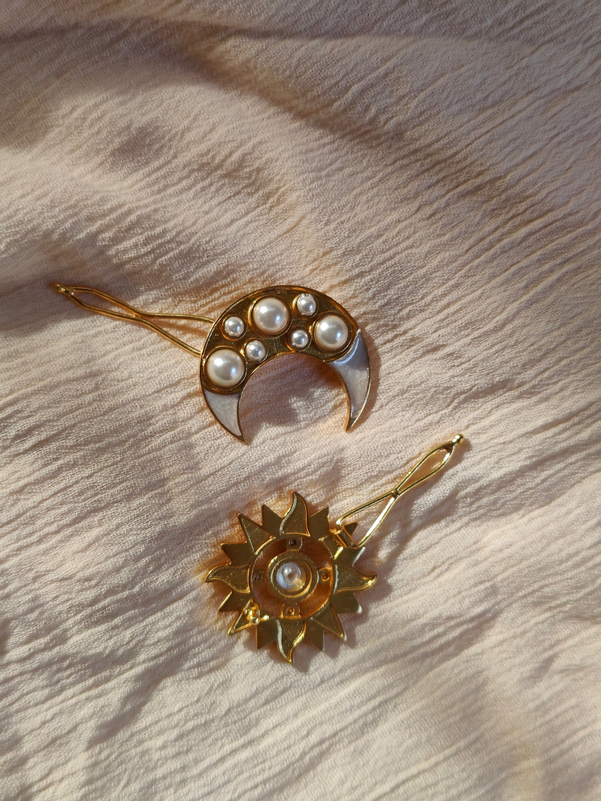 Elevate your choice of hairdo with this exquisite set of Aabha Iyla Hair Clips. Adorning these clips are gleaming faux pearls, meticulously set within the contours of the moon and the sun, creating an enchanting visual appeal while the ivory enamel coating radiates opulence and timelessness. Skillfully handcrafted, the Aabha Iyla Hair Clip is a must have in your hair accessories collection, and if you don’t have one yet, here’s where you start!