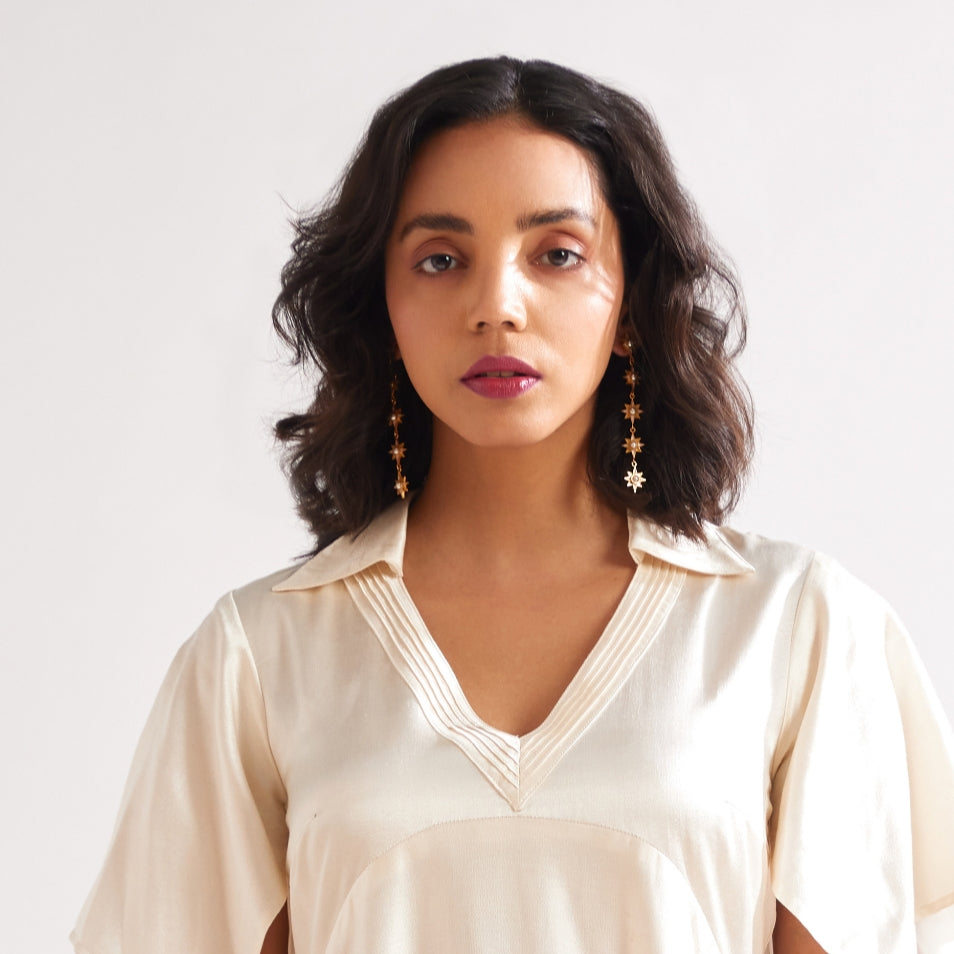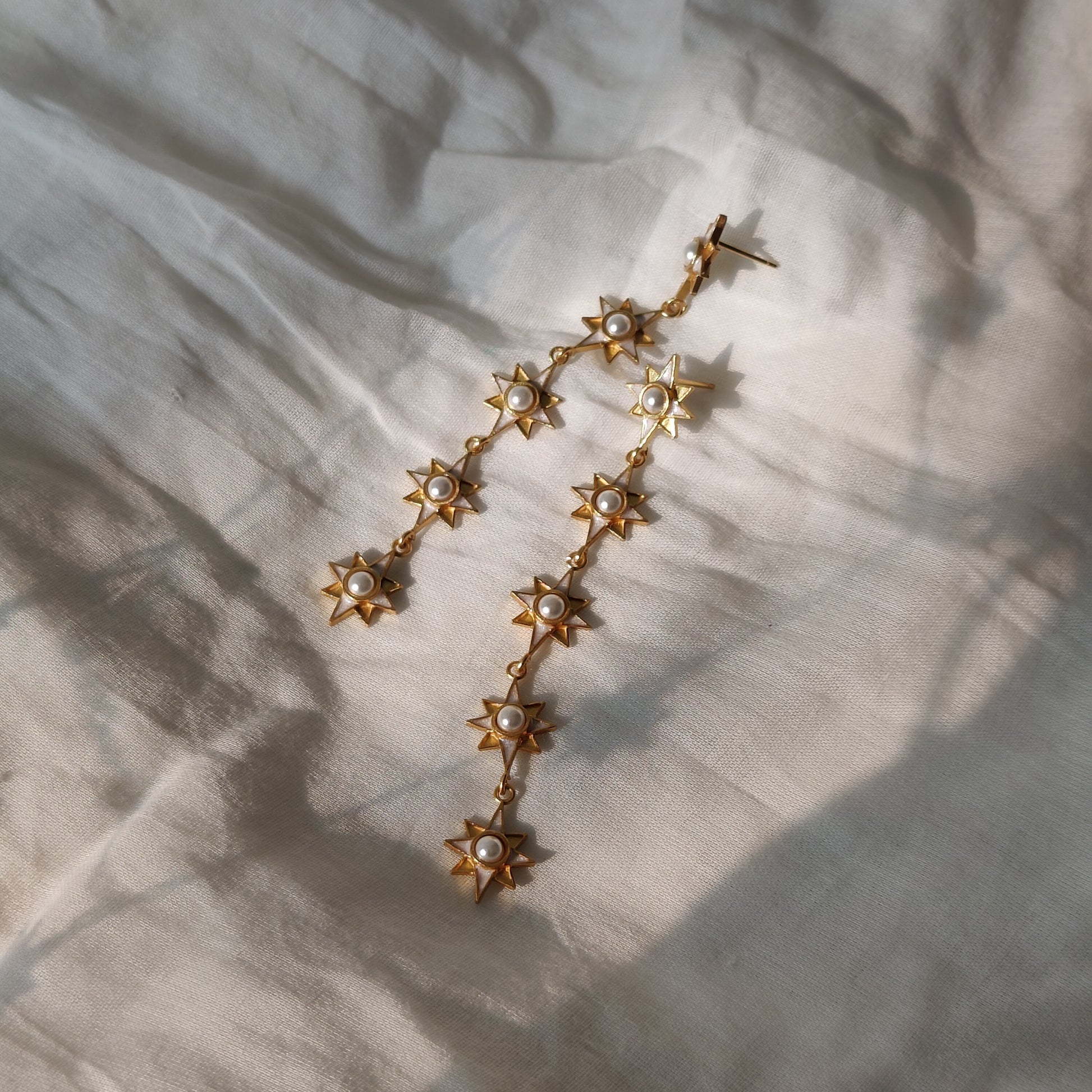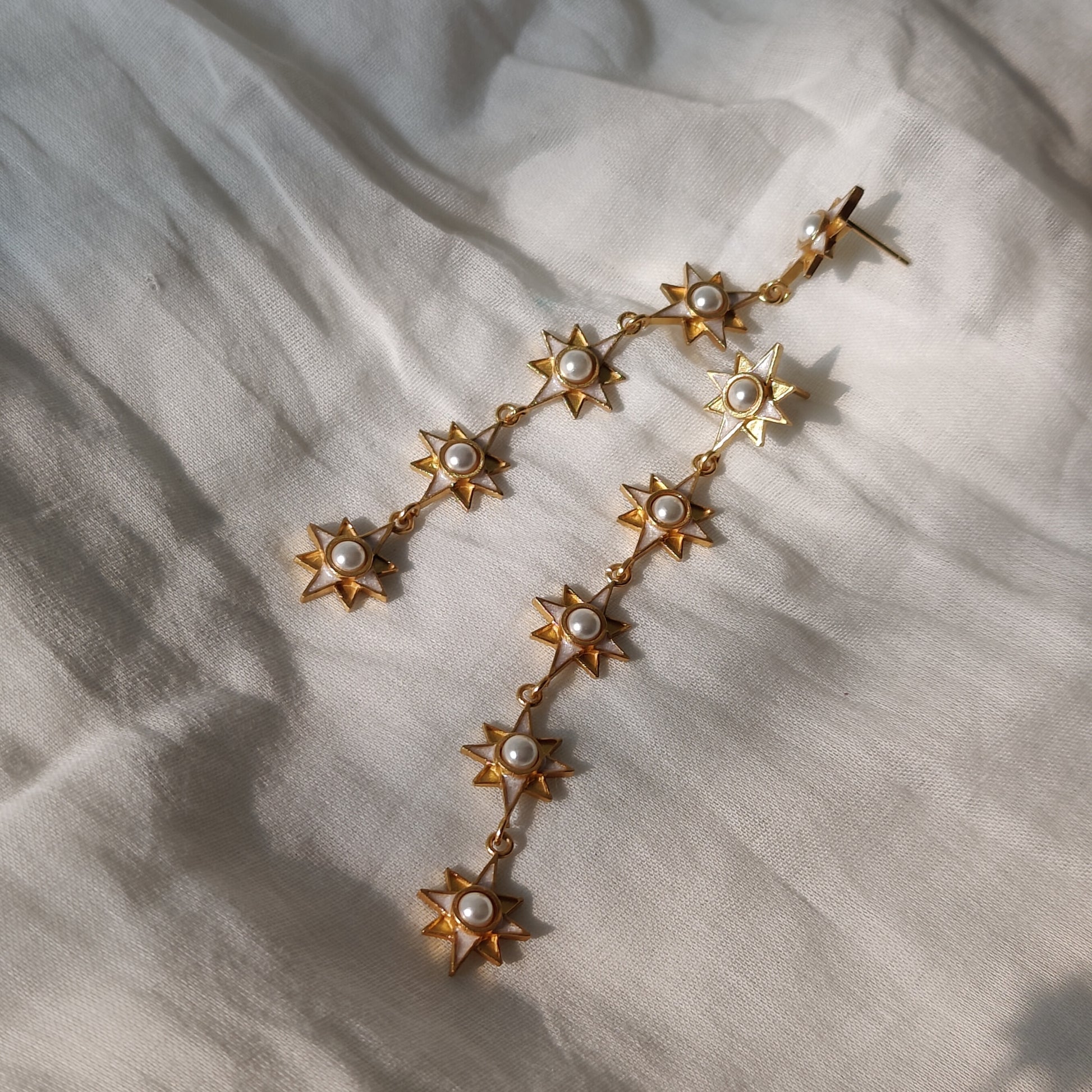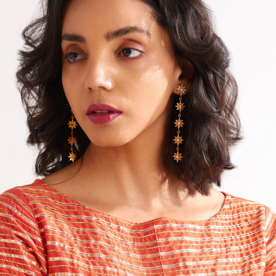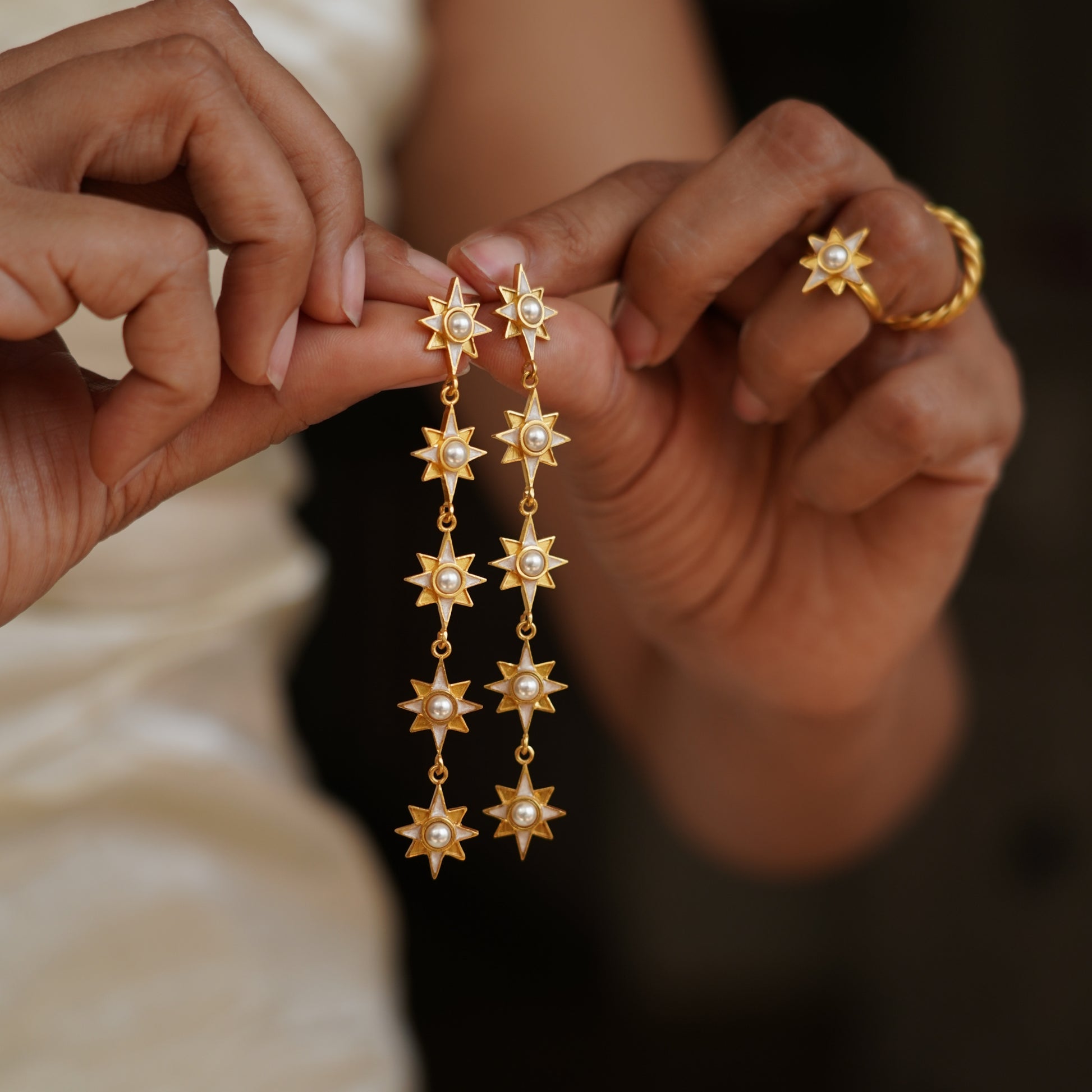 Get ready to turn some heads while you stand luminous as a clear night sky in your Choti Tara Danglers. Talk about channeling your inner celestial goddess, this stunning pair of earrings features five choti tara ivory enamel motifs with a push back closing. Resembling a string of twinkling stars in the multitudes of constellations we can see in the night sky, these earrings sure grab our attention with a second look every time we so much as glance at them.