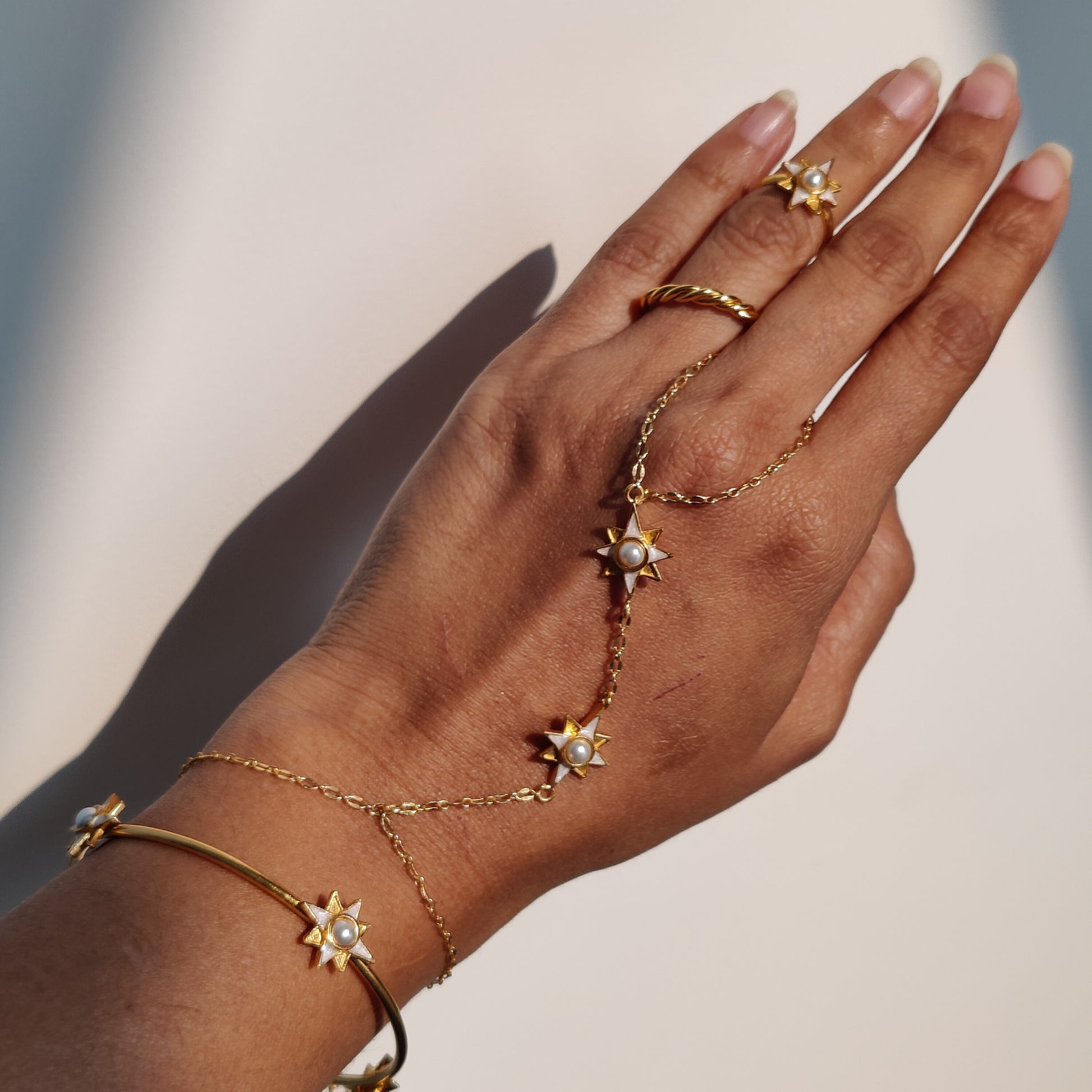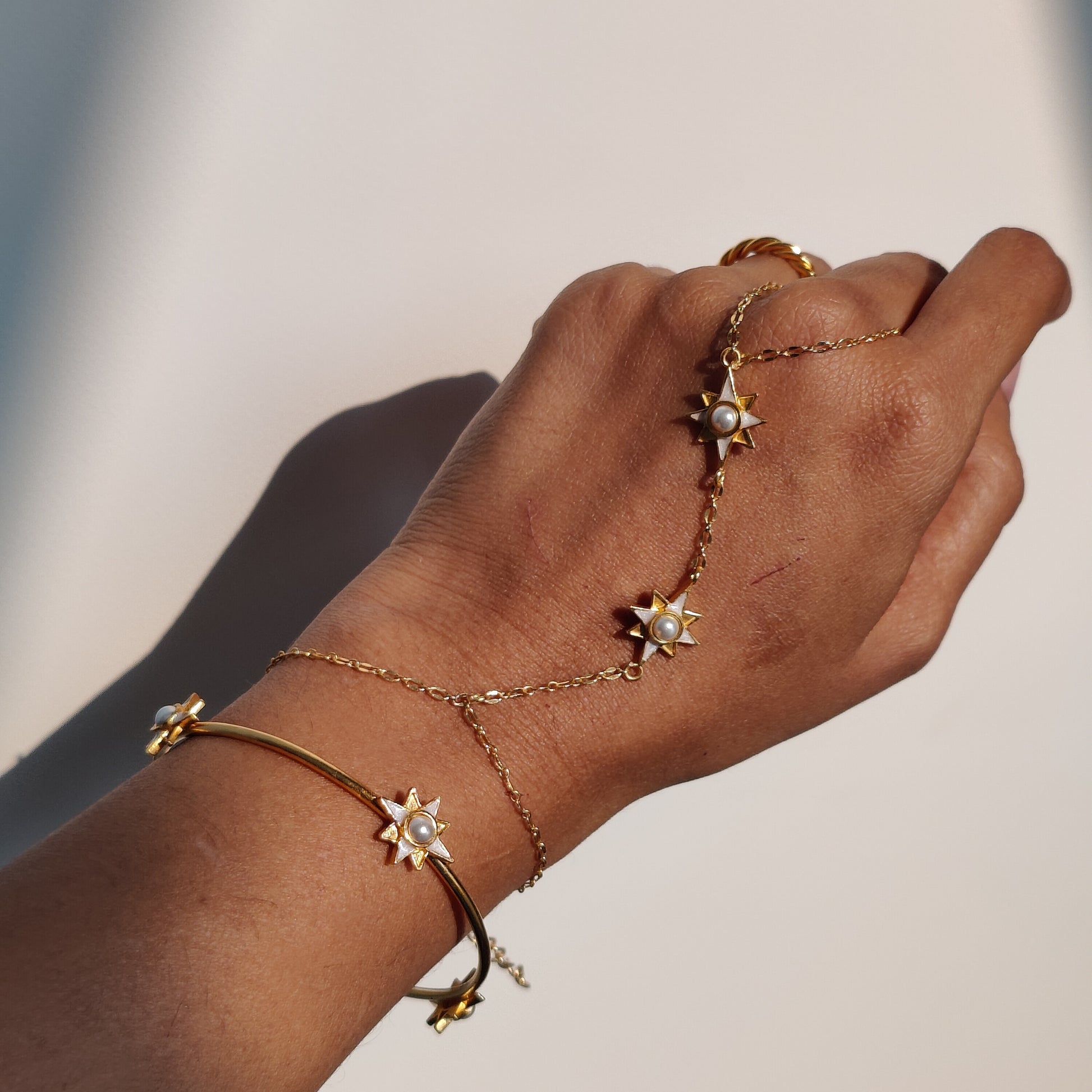 An absolutely understated piece of jewelry in the 21st century is the gorgeously accentuating haathphool. With its origins in India going back to the Mughal era, the haathphool was popularized by Mughal queens and courtesans. That’s right. Royalty, baby! The dreamy Choti Tara Haathphool is a minimal stunner featuring two choti tara motifs and a beautifully delicate cable link chain. The ivory enamel and faux pearls accent all skin tones and trace the movement of the hand so enchantingly you might just entrance those around you. Let your hands do the talking just got a new meaning!