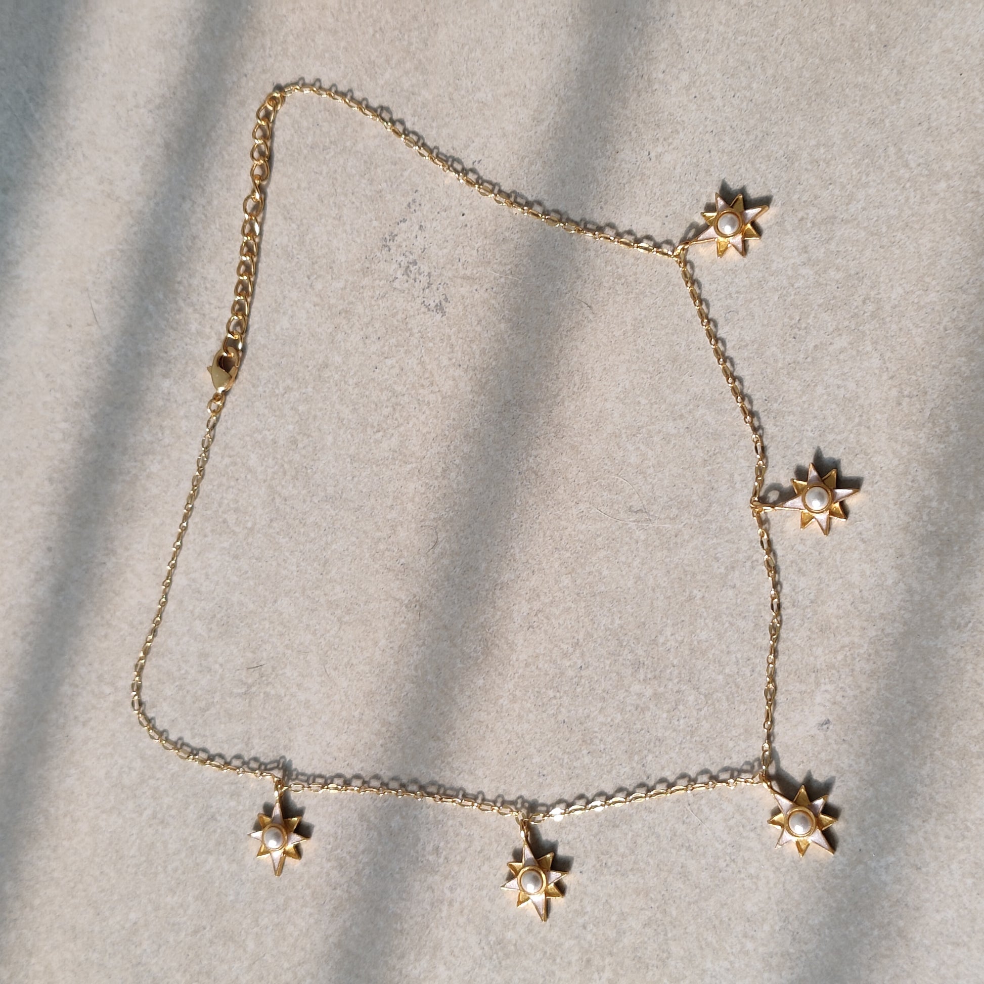 Captivate attention and make a cosmic statement with our Choti Tara Necklace. No matter your jewelry aesthetic, this piece is one to love love love. Let the dazzling radiance of the stars and your inner celestial light shine through with five choti tara motifs made with ivory enamel and faux pearls. We just know this one is going to be a favorite in your jewelry box!
