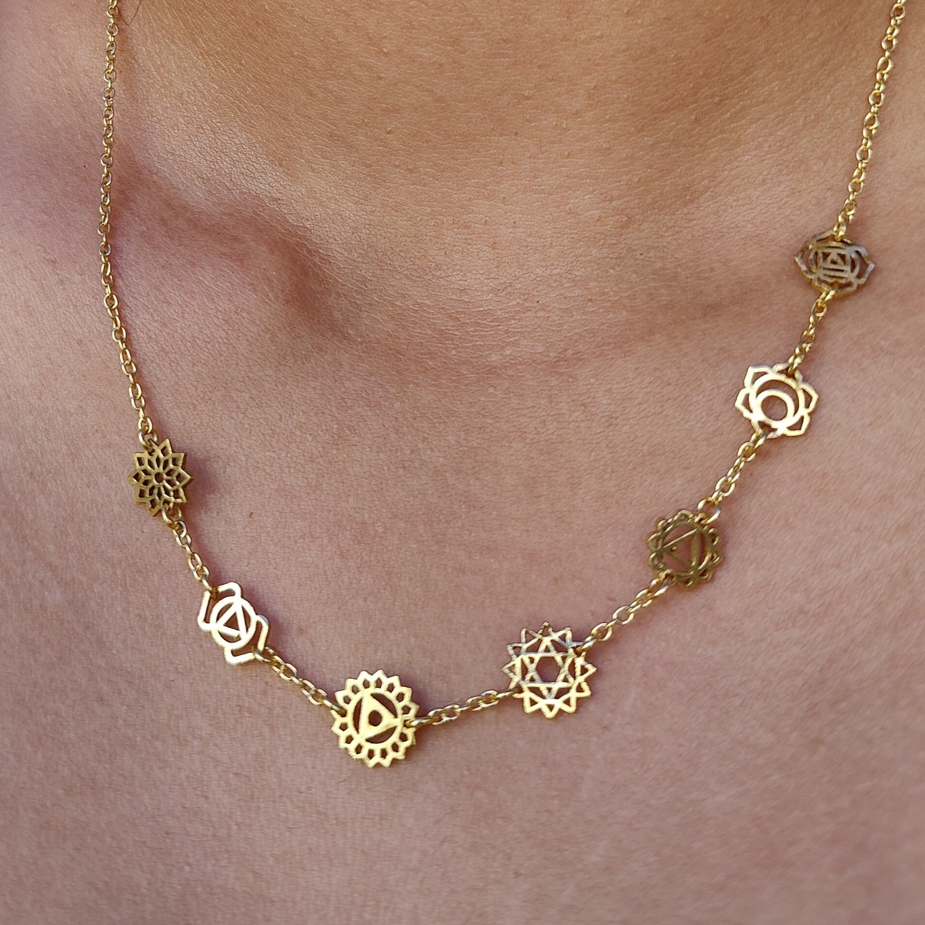 A dainty short minimal necklace, the stunning Delicia Chakra features 7 chakra charms representing the 7 chakras in the human body. This beauty sits just below the collar bone and is a complimenting piece to any neckline. It also makes a great addition to layered necklaces and stands out in the crowd no less.