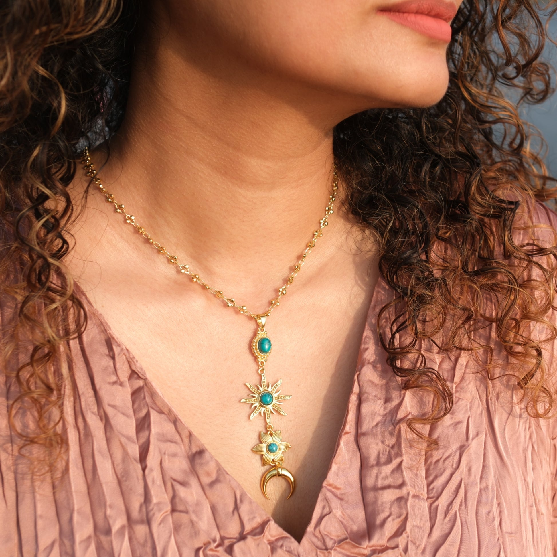 Elevate your style with our Firoza Surya Chandra Necklace featuring elegant sun and moon motifs. Crafted with turquoise, it will add a pop of color to any outfit. Express your inner celestial goddess with this stunning necklace.