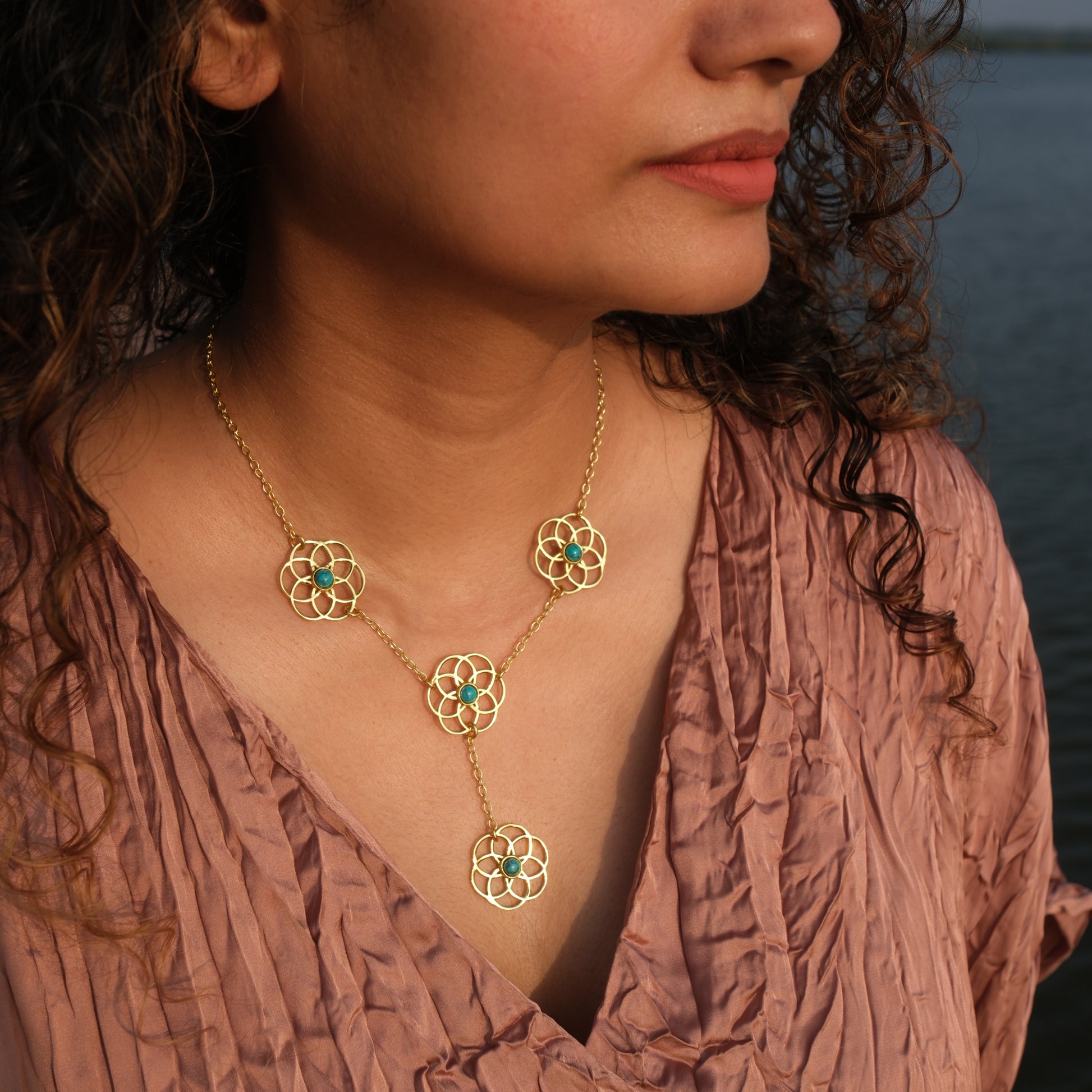 Make a statement with our exclusive Firoza Mandala Necklace. These beautiful, unique necklace feature stunning turquoise stones, adding a touch of elegance and sophistication to any outfit. Crafted from semi-precious materials, this choker is a must-have for any fashion-forward individual.