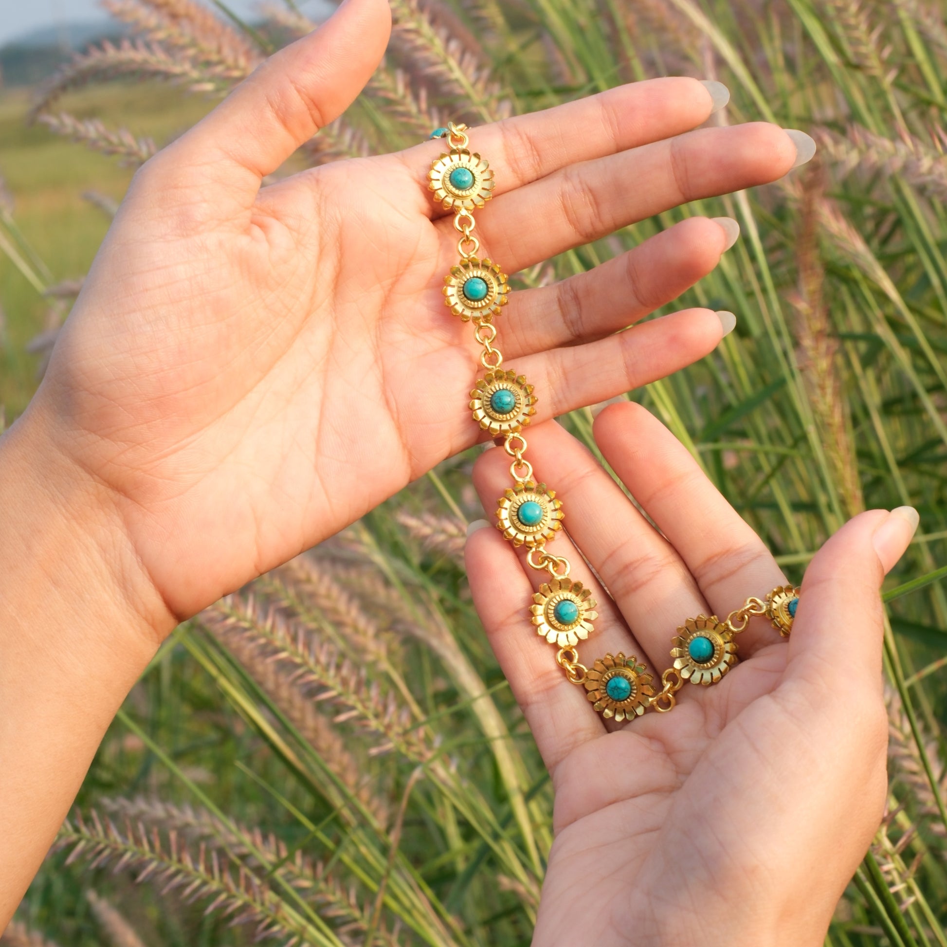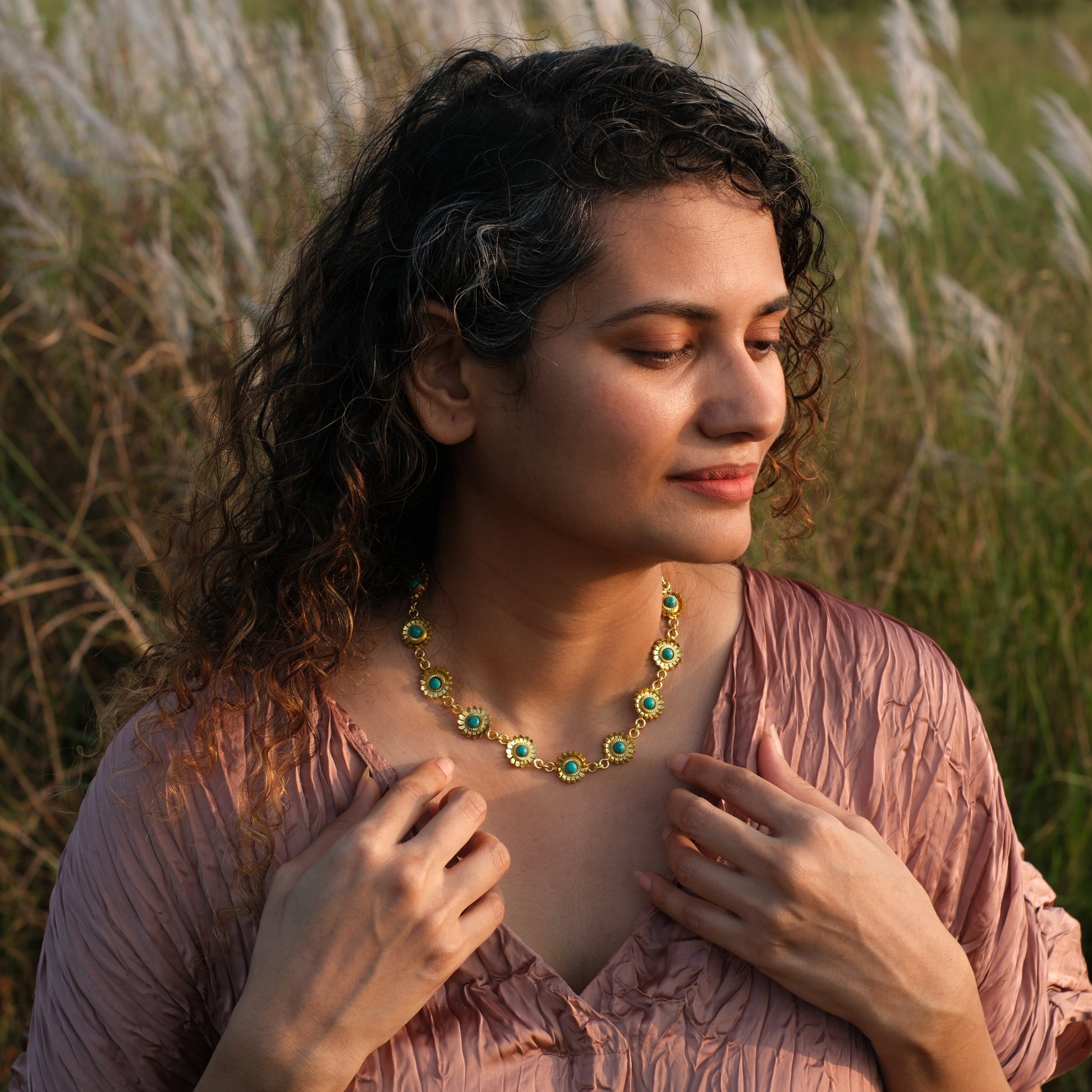 Make a statement with our exclusive Firoza Phool choker. These beautiful, unique necklace feature stunning turquoise stones, adding a touch of elegance and sophistication to any outfit. Crafted from semi-precious materials, this choker is a must-have for any fashion-forward individual.