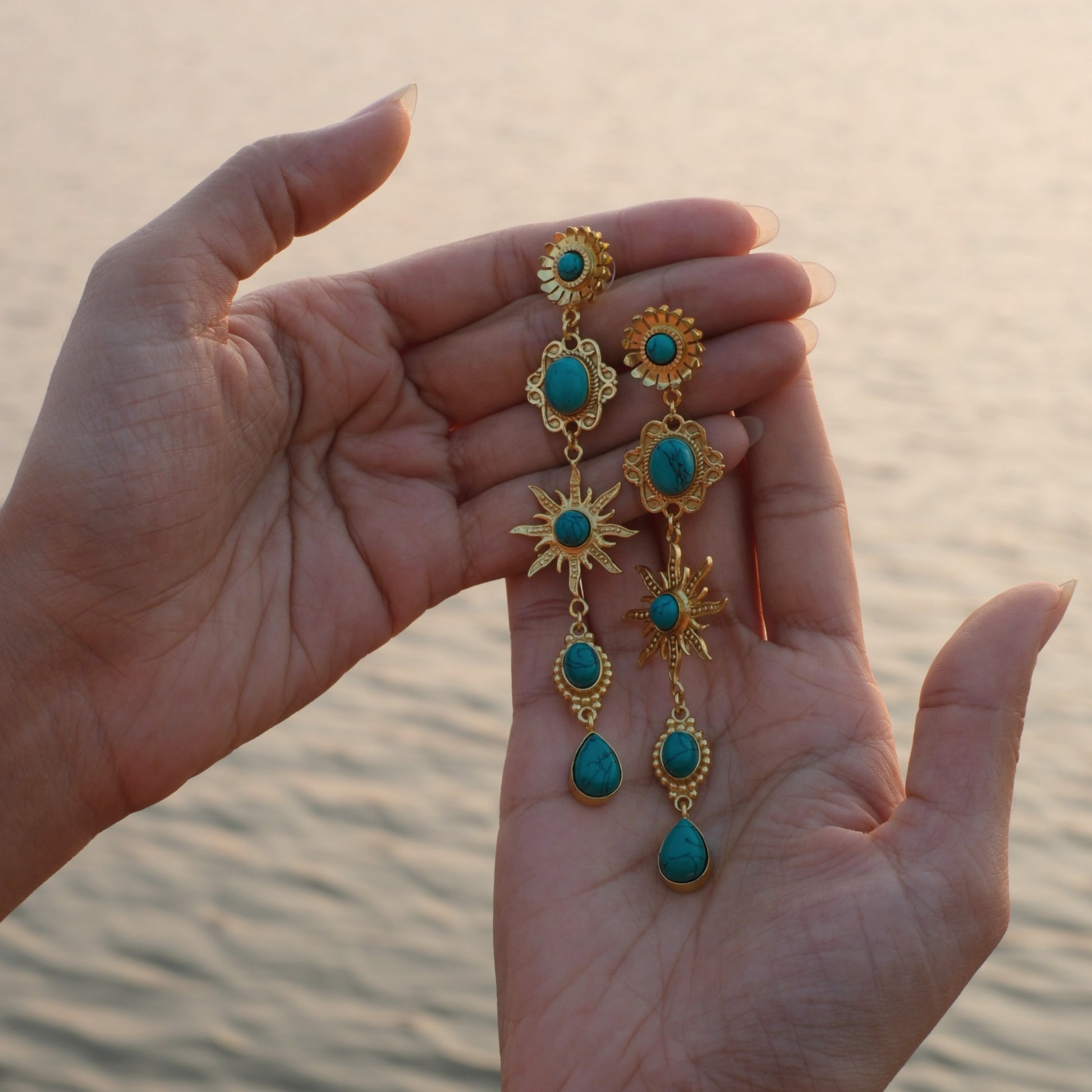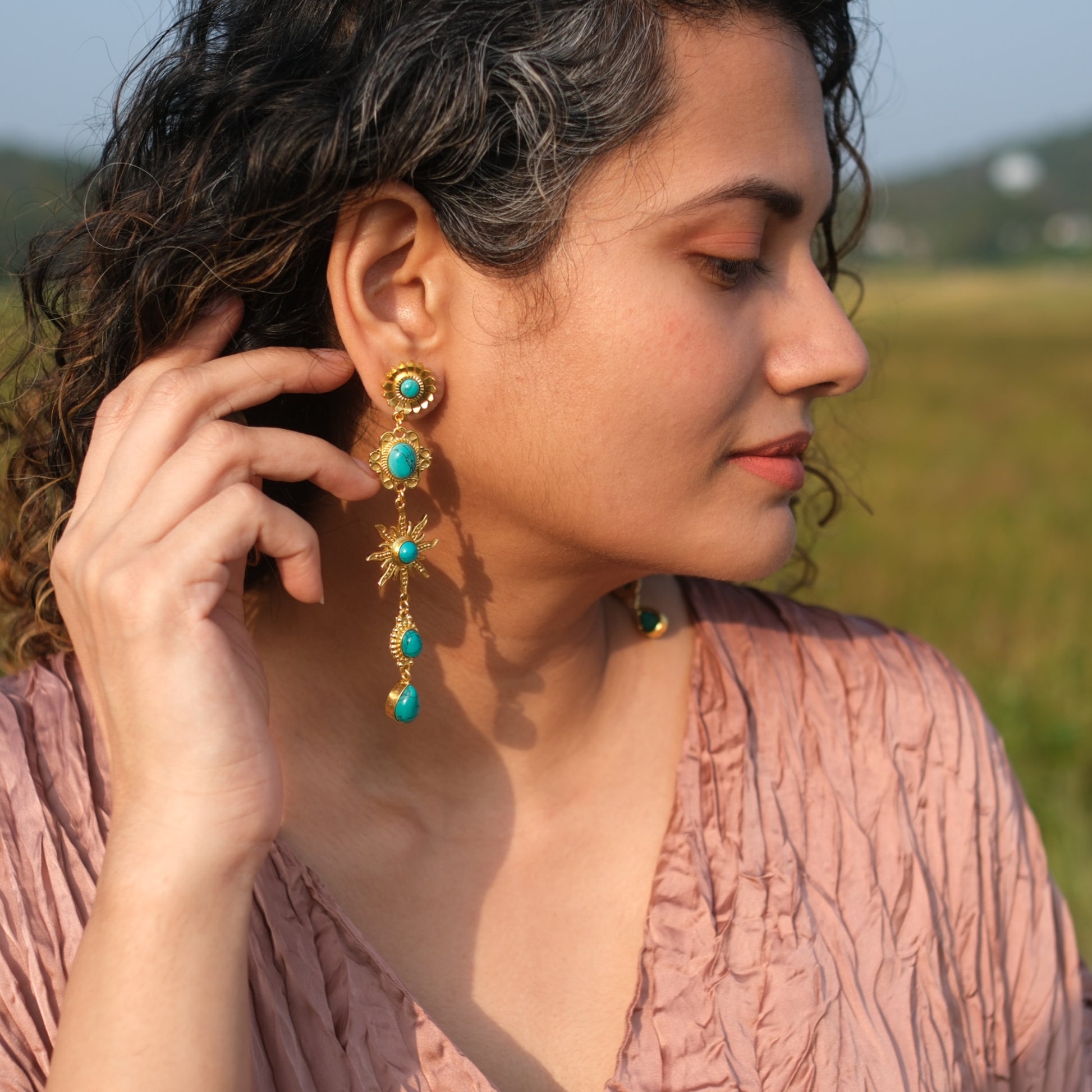 Make a statement with our exclusive Firoza Phool Earrings. These beautiful, unique earrings feature stunning turquoise stones, adding a touch of elegance and sophistication to any outfit. Crafted from semi-precious materials, these earrings are a must-have for any fashion-forward individual.