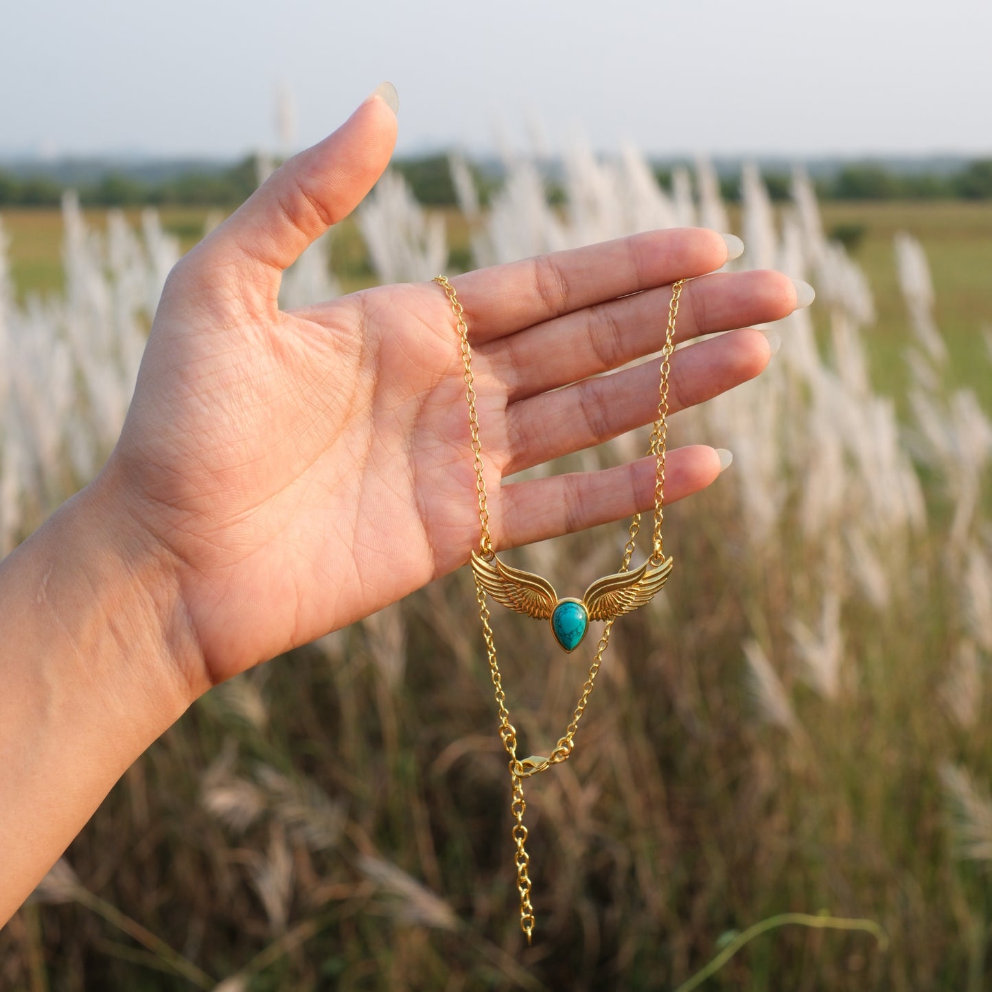 Discover the beautiful symbolism of our Firoza Wings Necklace. Crafted with angel wings and a turquoise stone, this necklace exudes a sense of peace and protection. Wear it as a reminder of your inner strength and spiritual connection. Made with expert precision, this necklace is both elegant and meaningful.