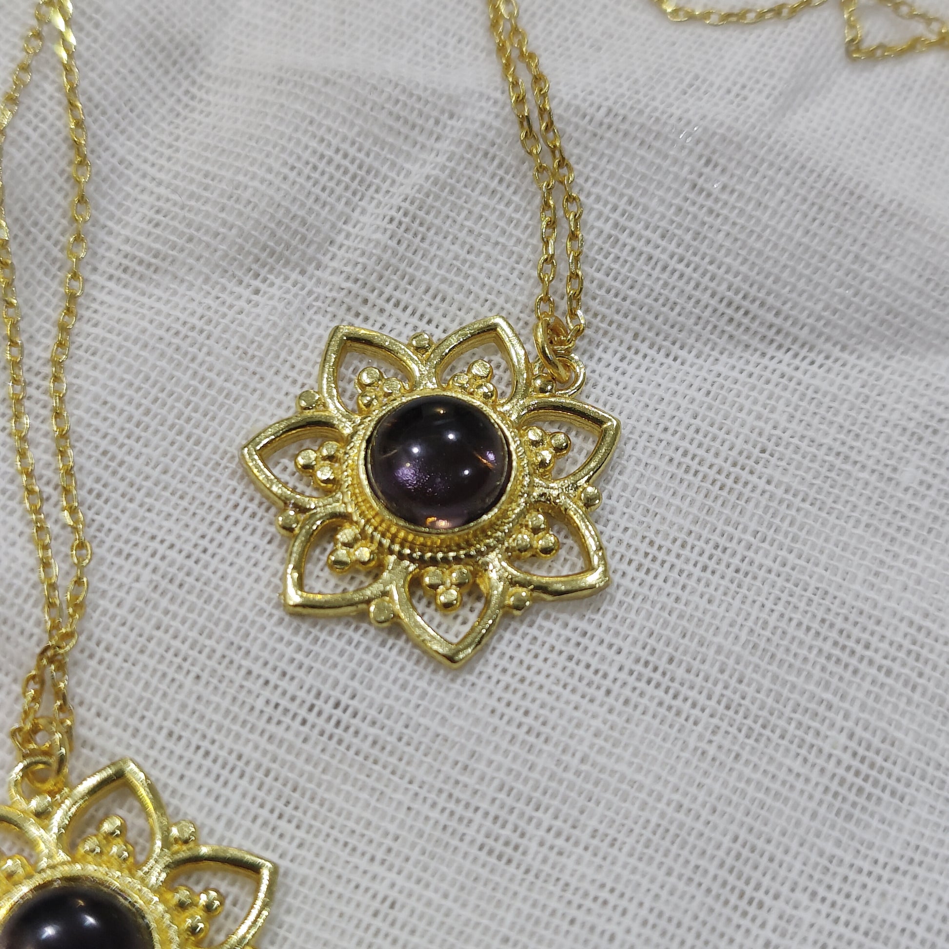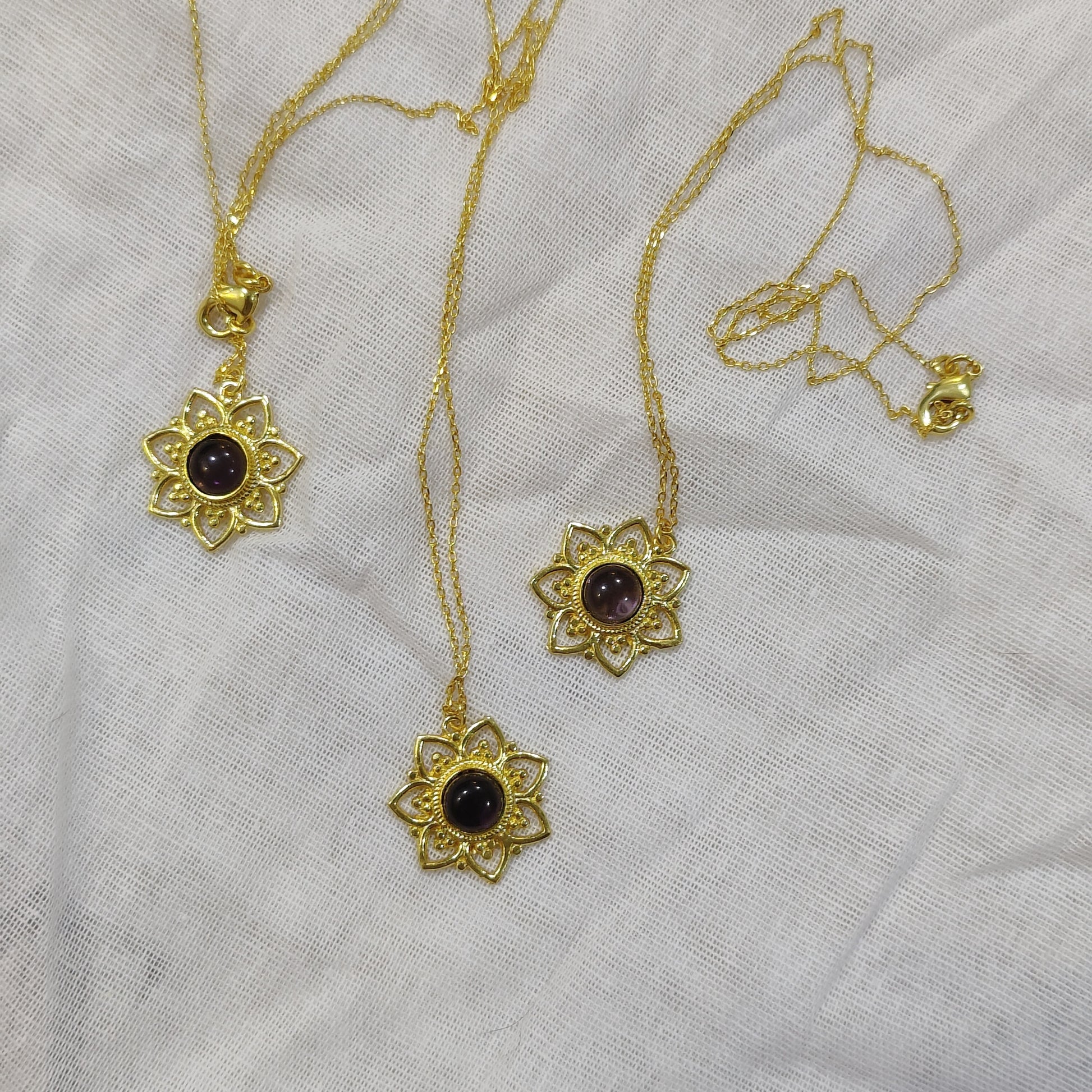 Flower Necklace adorned with an amethyst cabochon with a dainty delicate chain. 18 inches in length. Pendent is 22mm in size