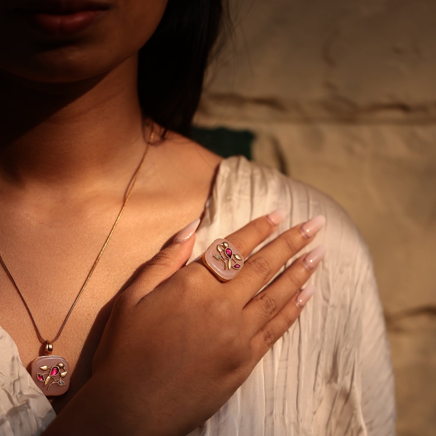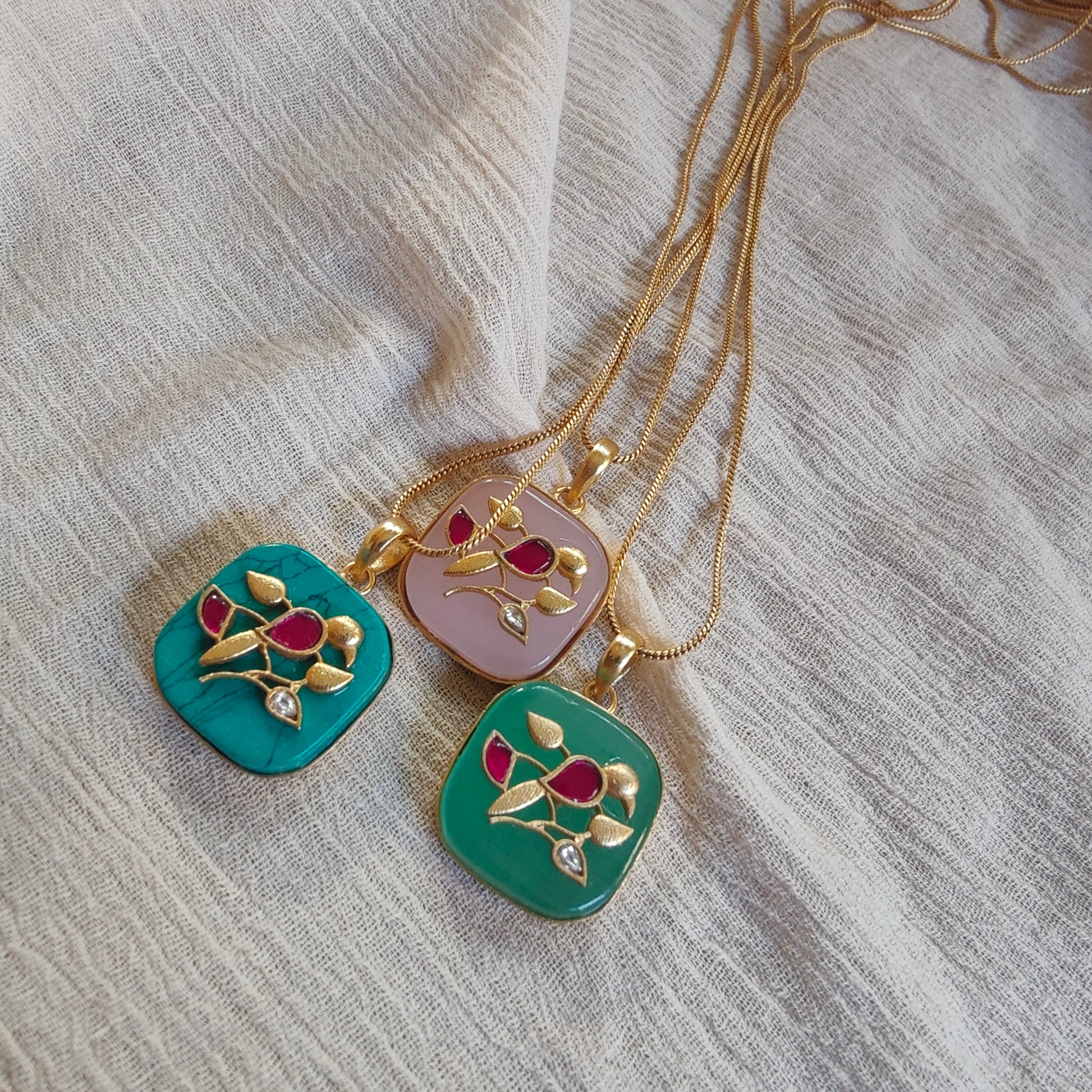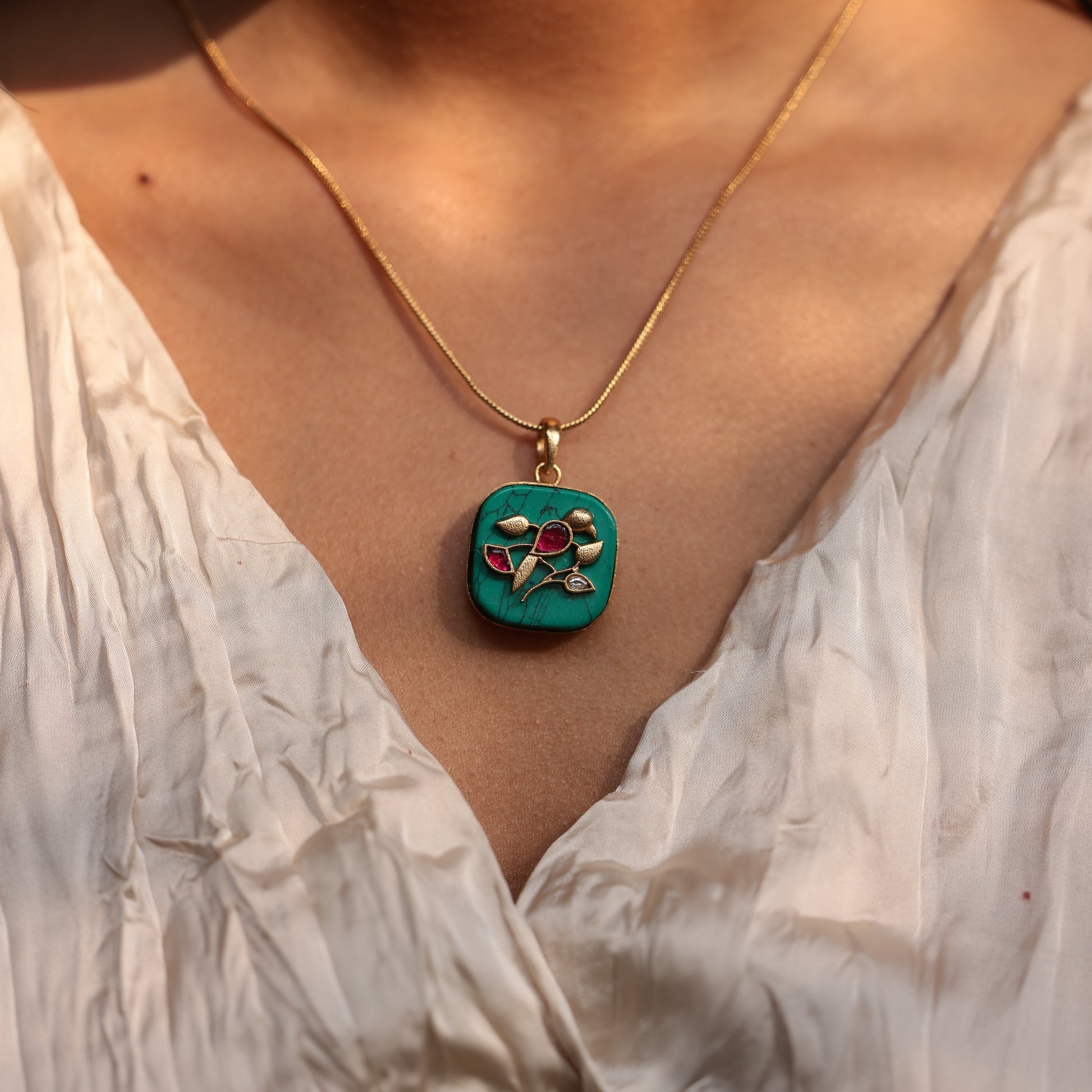 Please note that all our jewelry is handmade. This means every piece is unique and might have its own small imperfections since all pieces are hand cut, soldered, and plated manually by our gifted karigars.