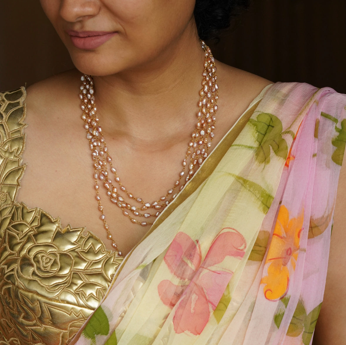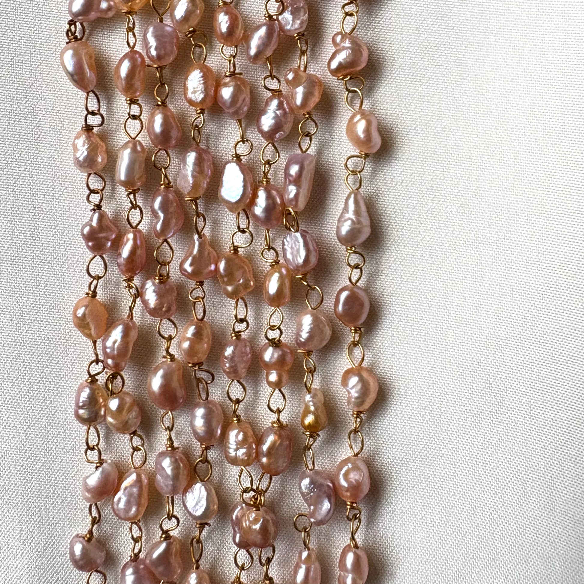 Gold plated brass necklace with freshwater pearls. Length is 90 inches. Can be layered up to 7 times as a choker or 4-6 times across different heights as a layered necklace. This versatile rope can also be worn as a bracelet or waist chain