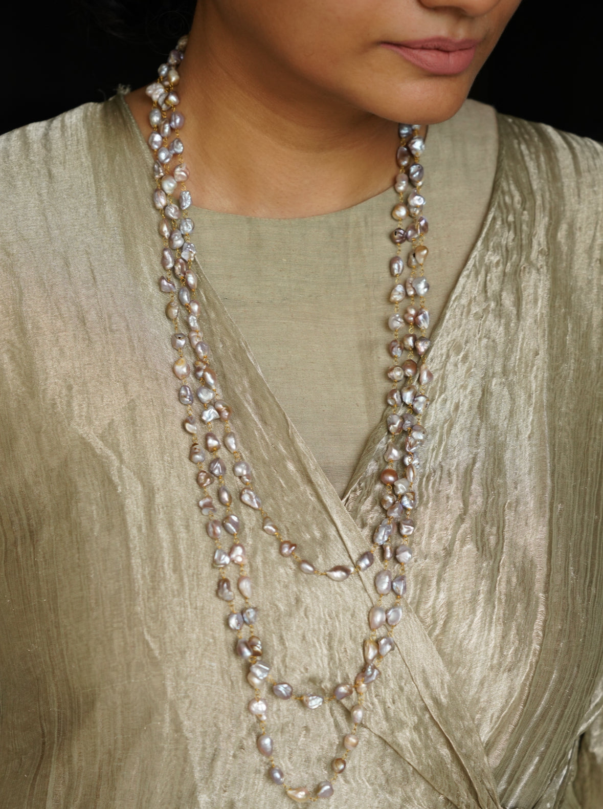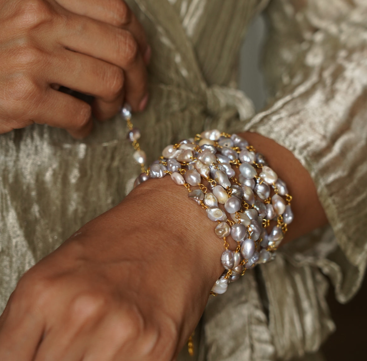 Gold plated brass necklace with freshwater pearls. Length is 90 inches. Can be layered up to 7 times as a choker or 4-6 times across different heights as a layered necklace. This versatile rope can also be worn as a bracelet or waist chain