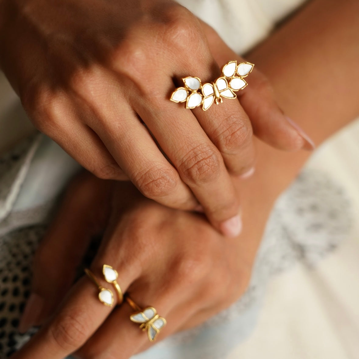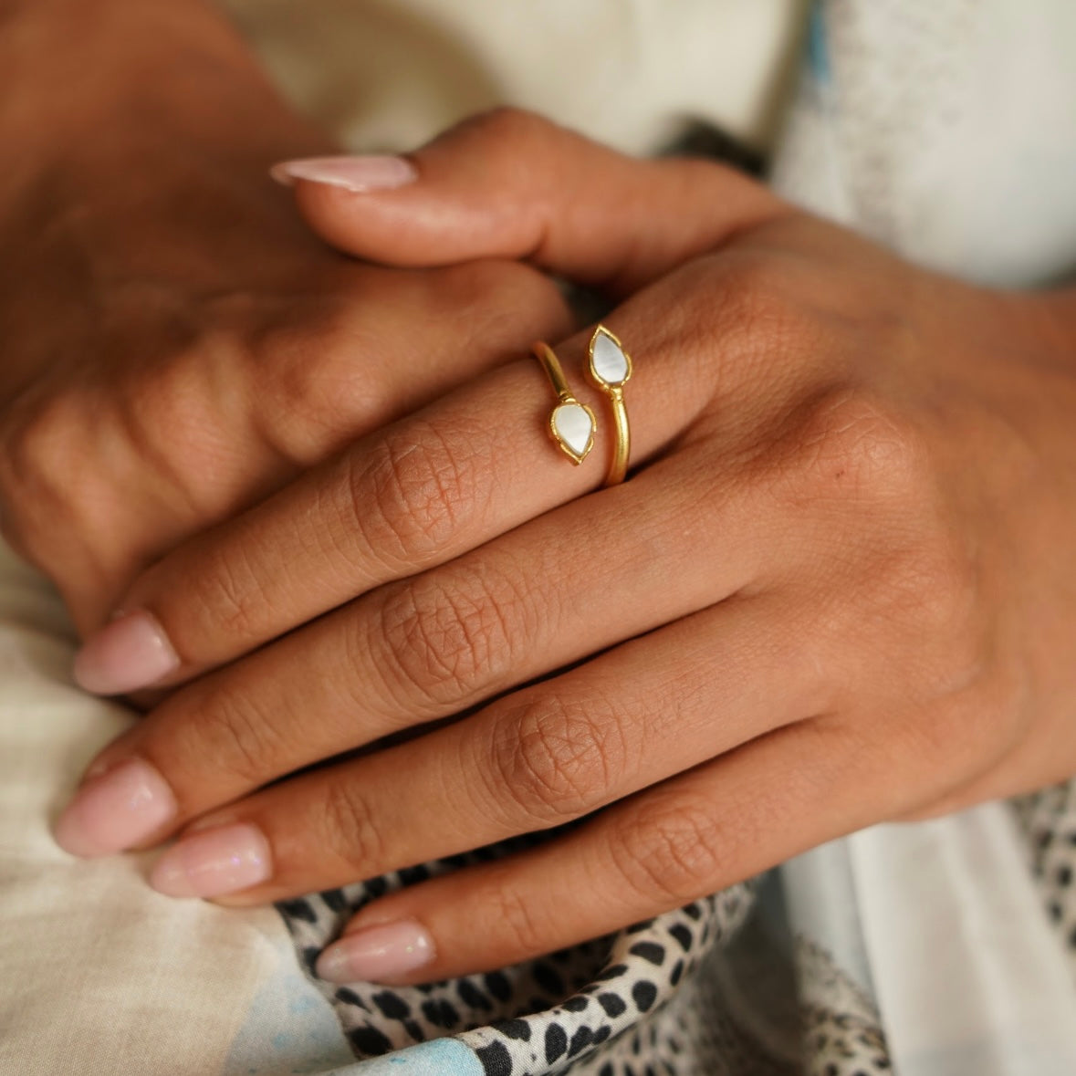 The Leaf Adjustable Ring features two leaf motifs crafted from genuine mother of pearl, displaying subtle iridescence that catches light beautifully. This minimalist piece offers sophisticated versatility and the adjustable design ensures comfortable fit across sizes