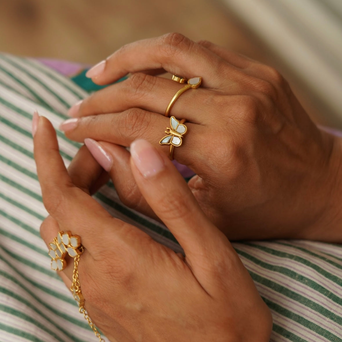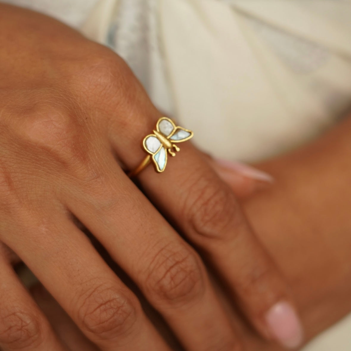 The Mariposa Ring features an elegant butterfly motif crafted from genuine mother of pearl, displaying subtle iridescence that catches light beautifully. This minimalist piece offers sophisticated versatility and the adjustable design ensures comfortable fit across sizes