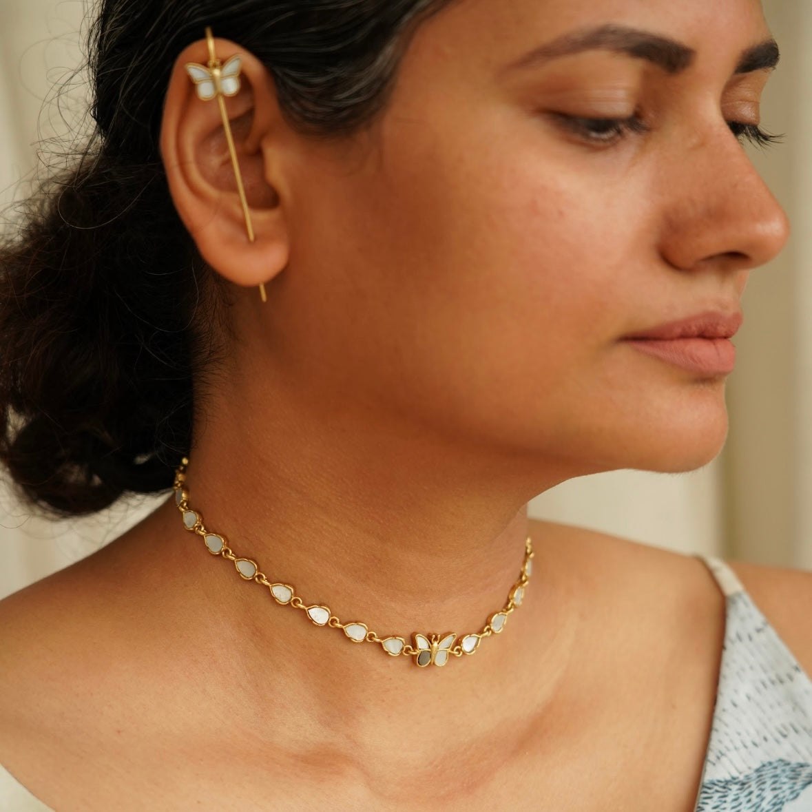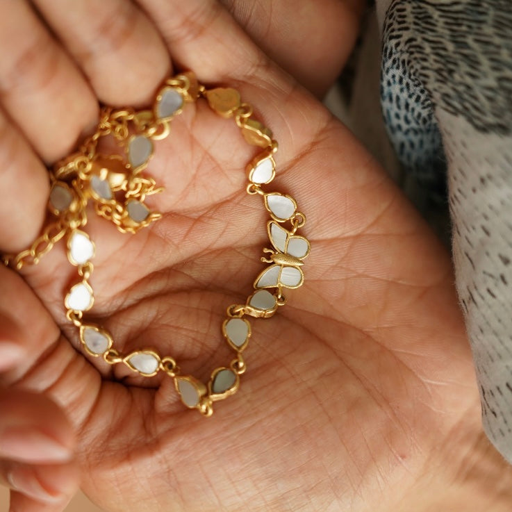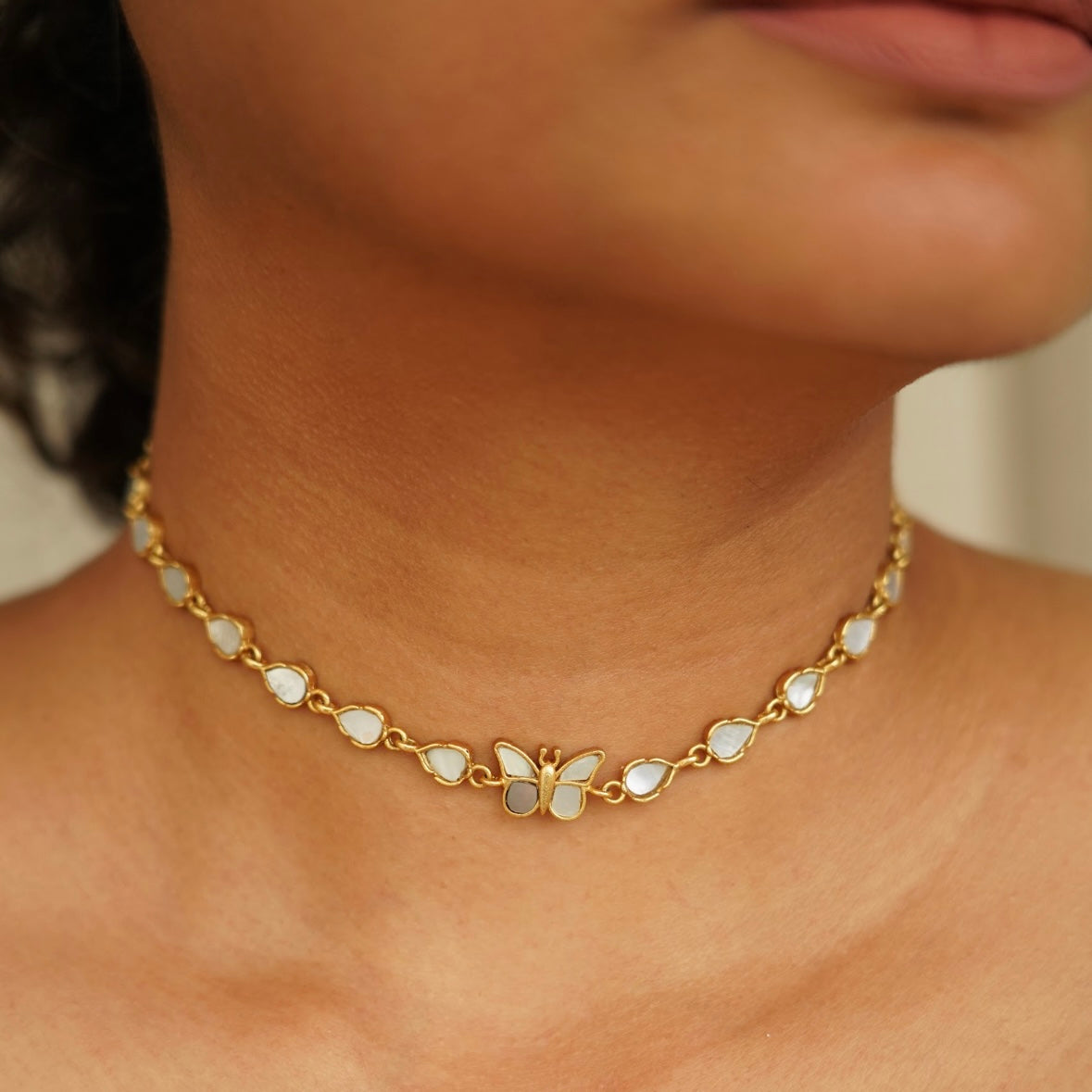 The Vine Choker combines delicate butterfly and leaf motifs with luminous mother of pearl elements for a statement of refined elegance. This versatile choker sits gracefully at the neckline while offering seamless layering potential with other necklaces. The natural iridescence of mother of pearl catches light beautifully, adding a sophisticated shimmer to both everyday and special occasion ensembles.
