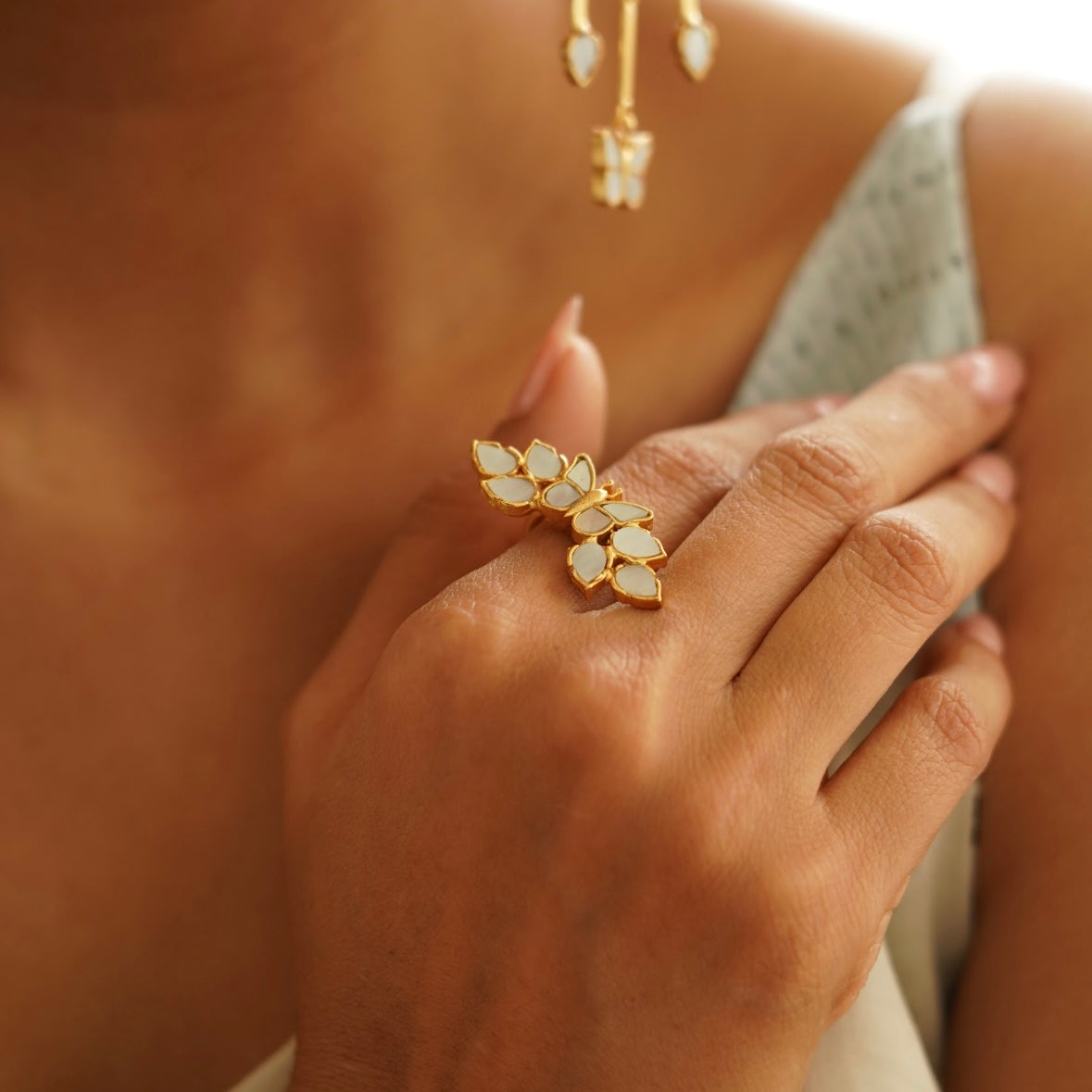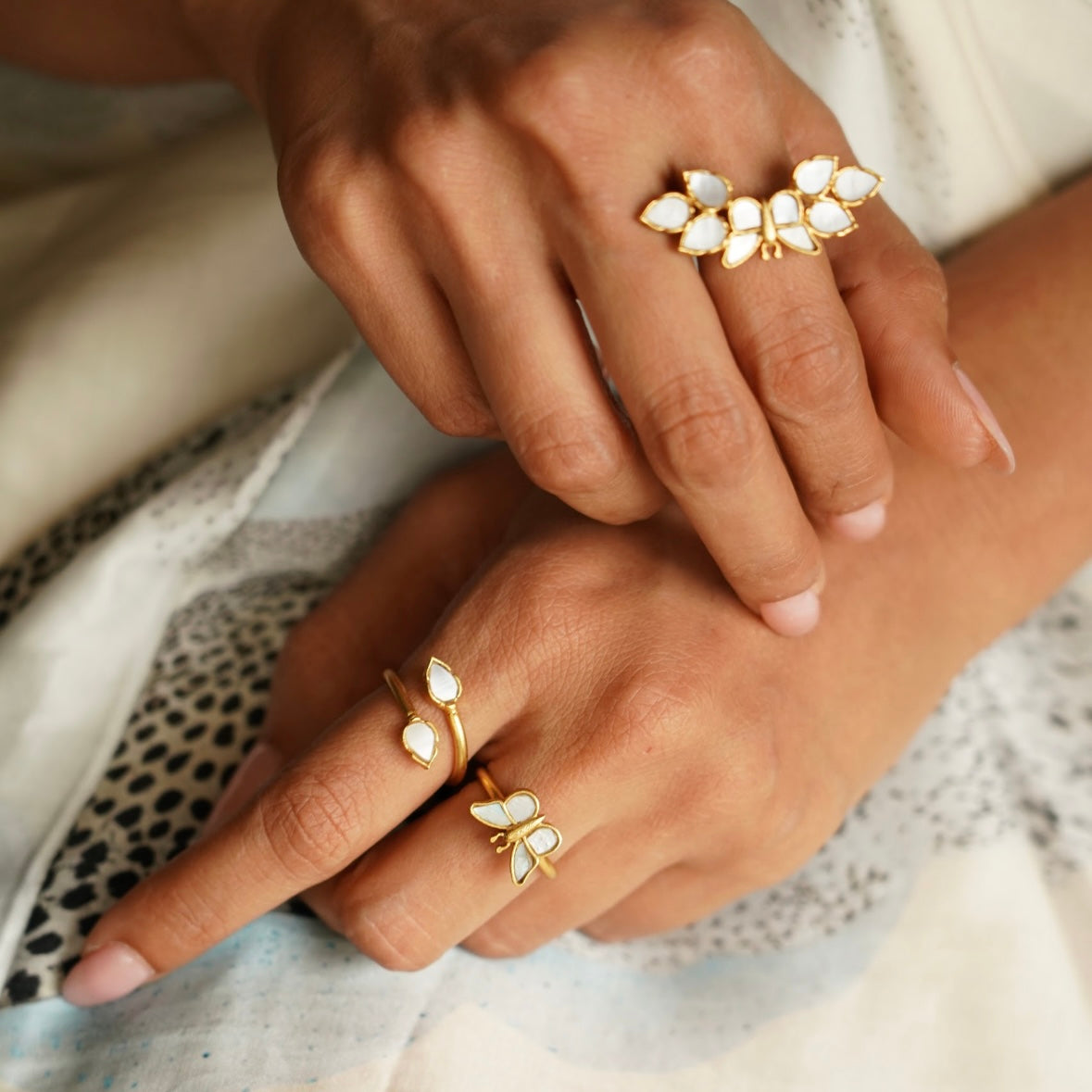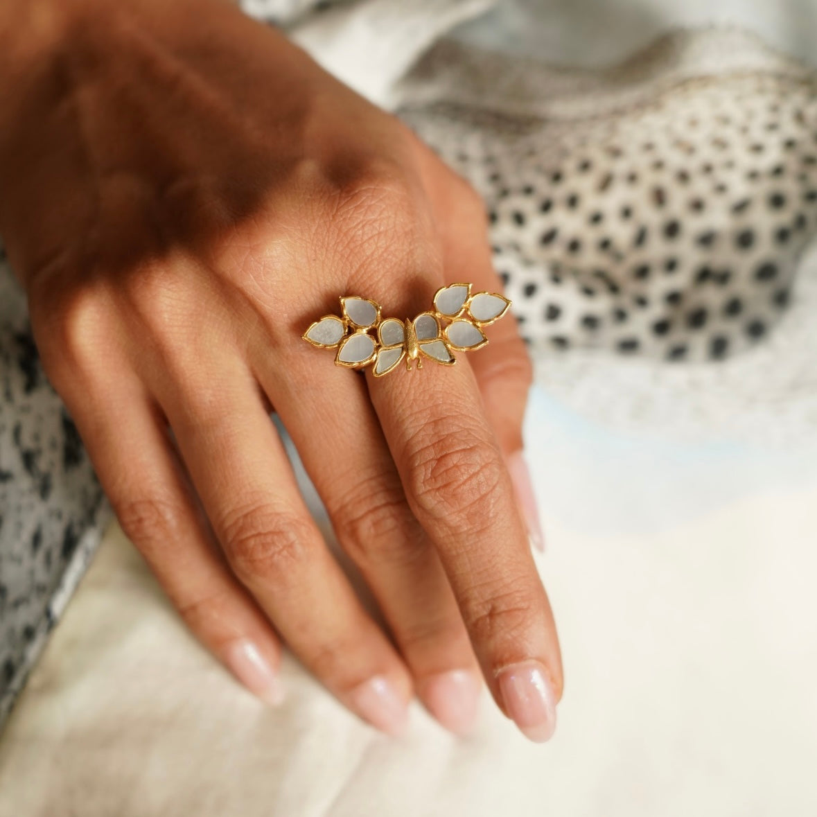 The Mariposa Statement Ring features an elegant butterfly motif crafted from genuine mother of pearl, displaying subtle iridescence that catches light beautifully. This minimalist piece offers sophisticated versatility and the adjustable design ensures comfortable fit across sizes