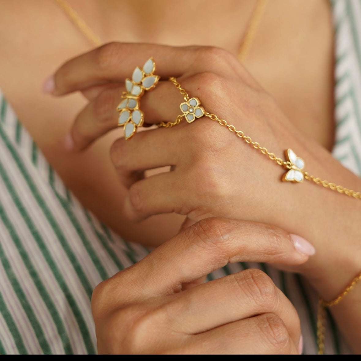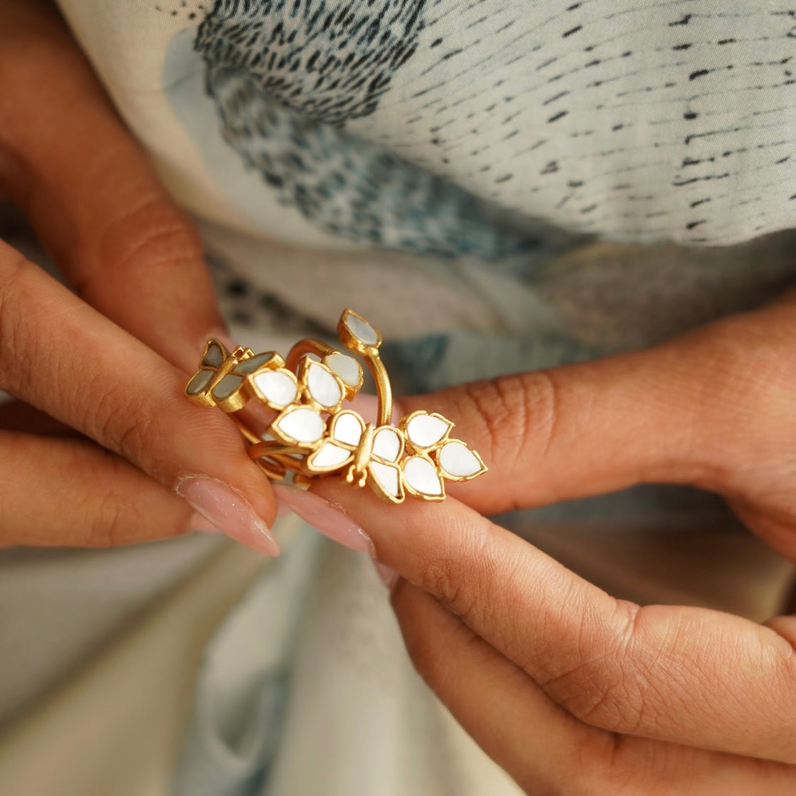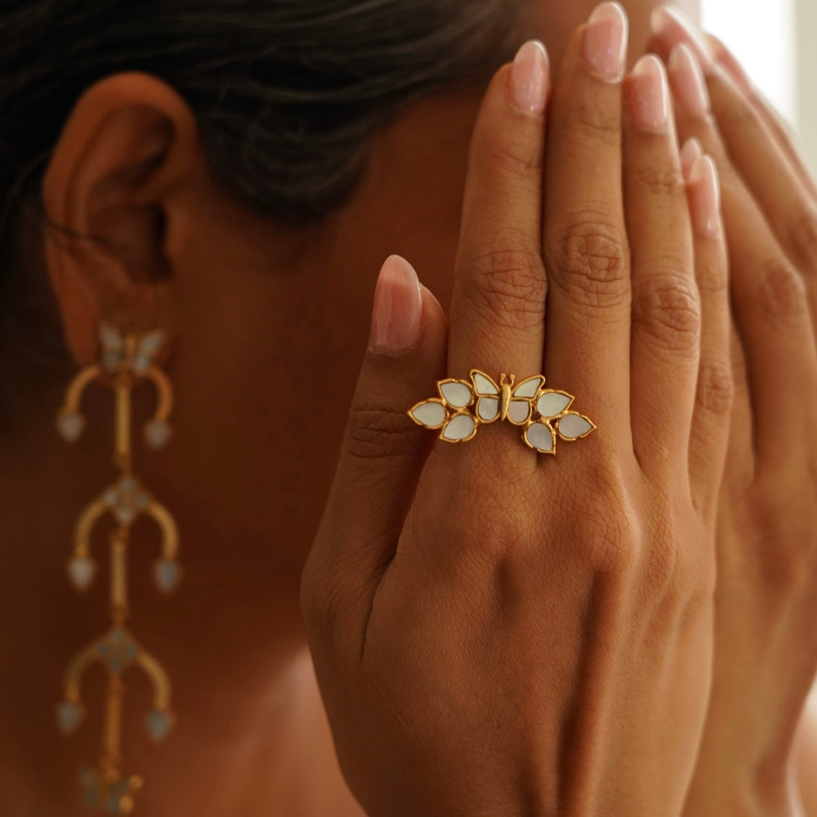 The Mariposa Statement Ring features an elegant butterfly motif crafted from genuine mother of pearl, displaying subtle iridescence that catches light beautifully. This minimalist piece offers sophisticated versatility and the adjustable design ensures comfortable fit across sizes