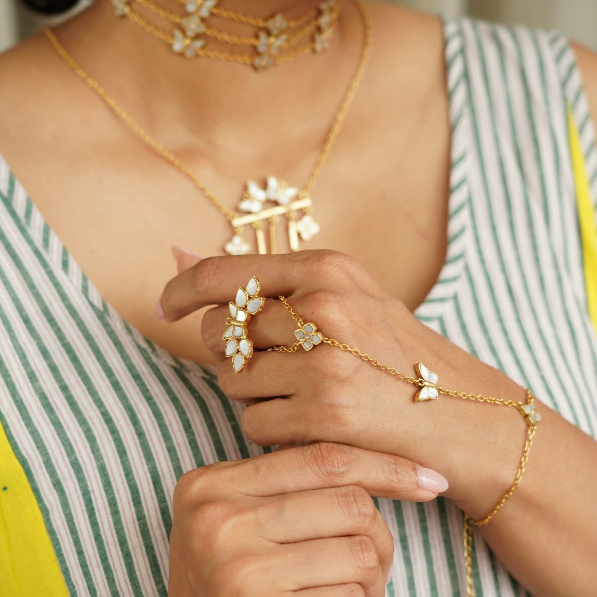 Please note that all our jewelry is handmade. This means every piece is unique and might have its own small imperfections since all pieces are hand cut, soldered, and plated manually by our gifted karigars.
