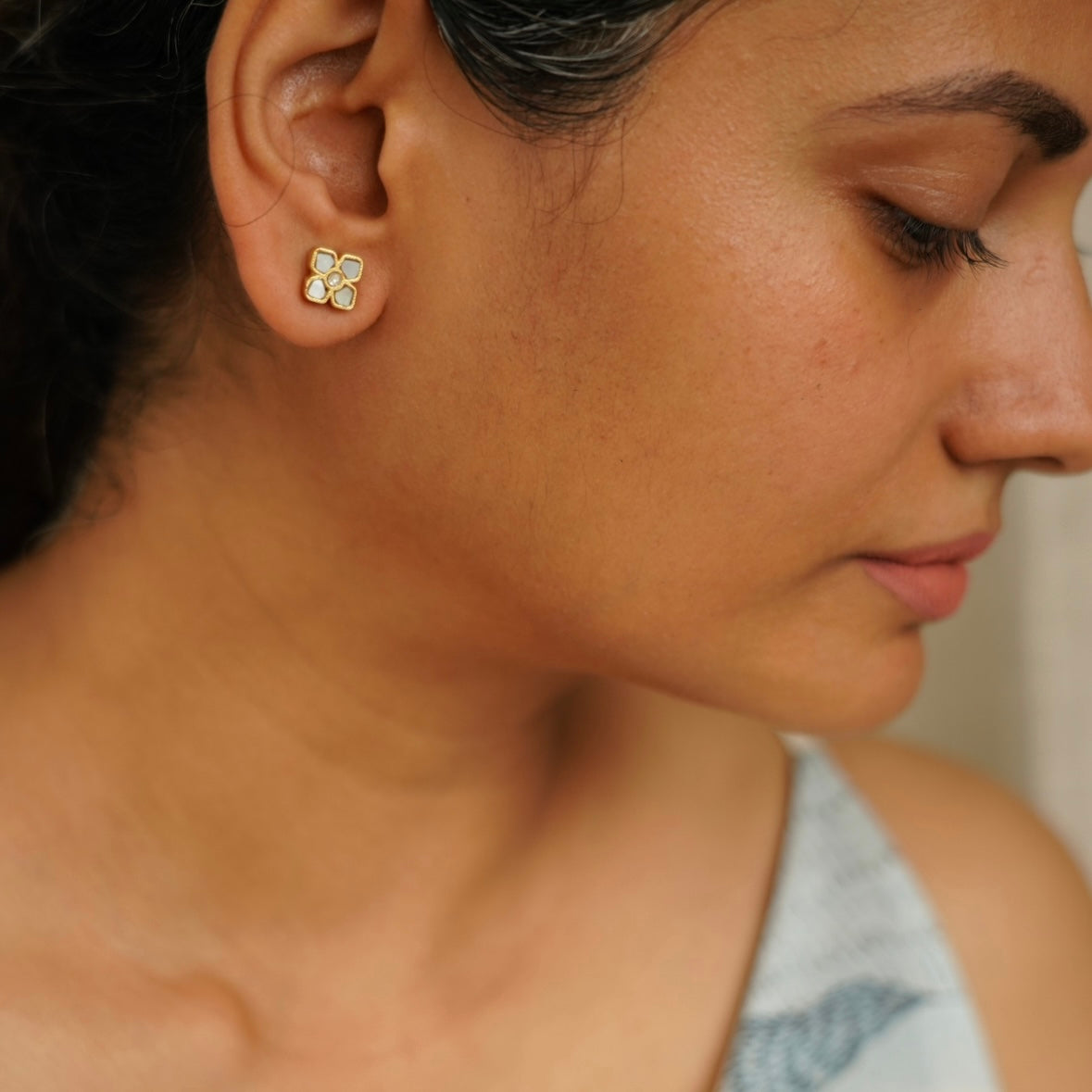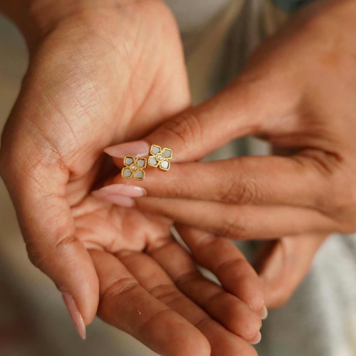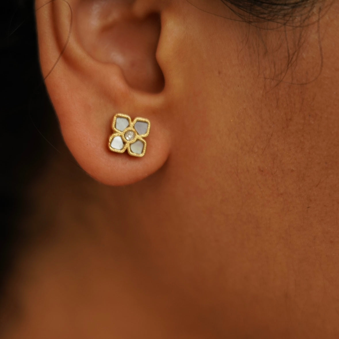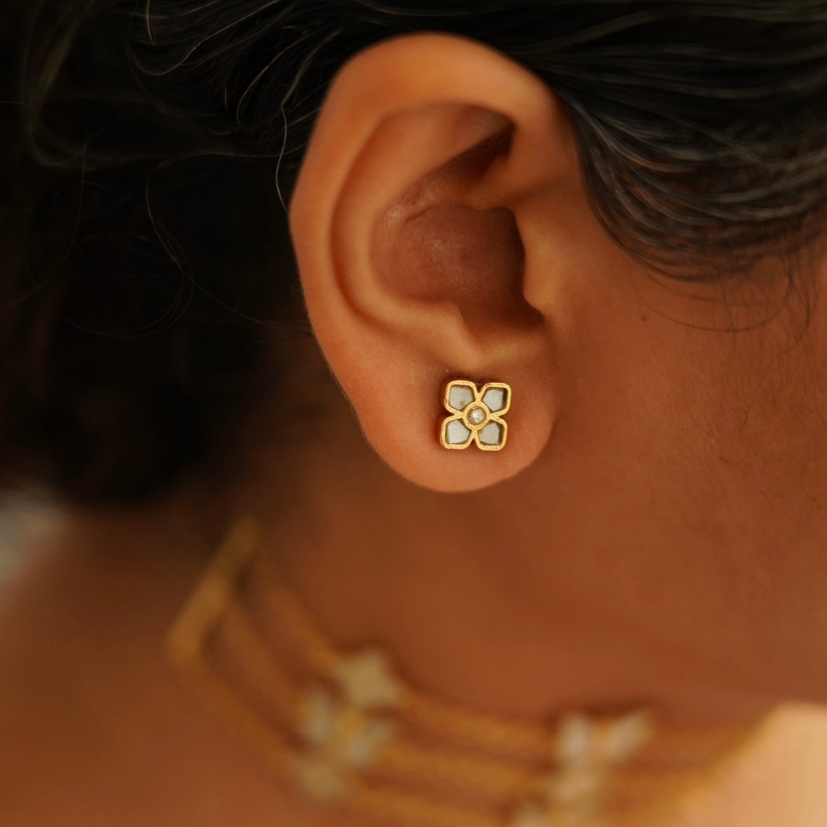 The Ixora Stud Earrings feature meticulously crafted flower motifs rendered in lustrous mother of pearl, set against a refined gold-plated framework. These minimal yet distinctive pieces showcase the natural iridescence of mother of pearl, creating subtle dimension and light reflection with every movement. Precisely balanced in their proportions, these earrings offer sophisticated elegance that complements both everyday attire and special occasion ensembles without overwhelming.