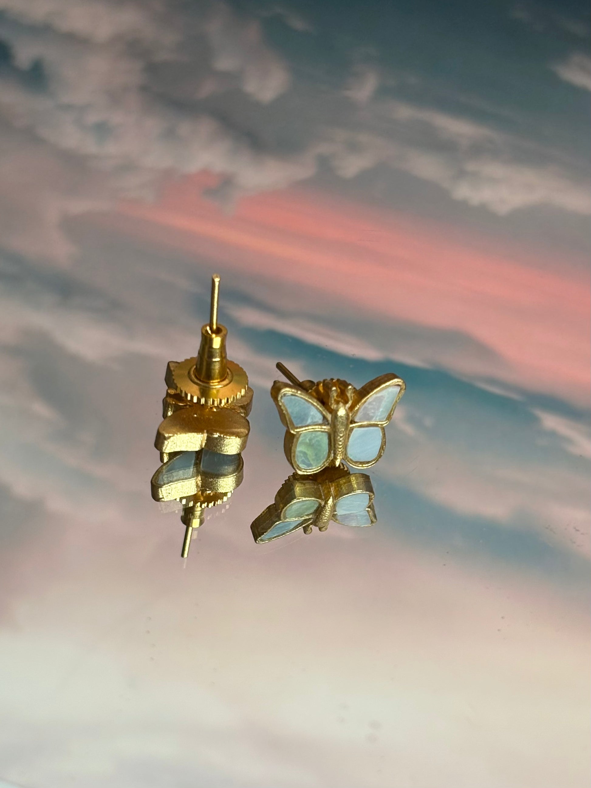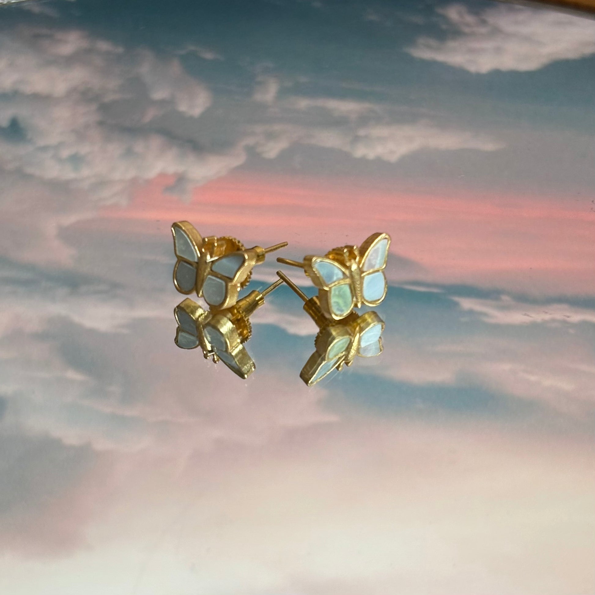 The Mariposa Stud Earrings feature meticulously crafted butterfly motifs rendered in lustrous mother of pearl, set against a refined gold-plated framework. These minimal yet distinctive pieces showcase the natural iridescence of mother of pearl, creating subtle dimension and light reflection with every movement. Precisely balanced in their proportions, these earrings offer sophisticated elegance that complements both everyday attire and special occasion ensembles without overwhelming.
