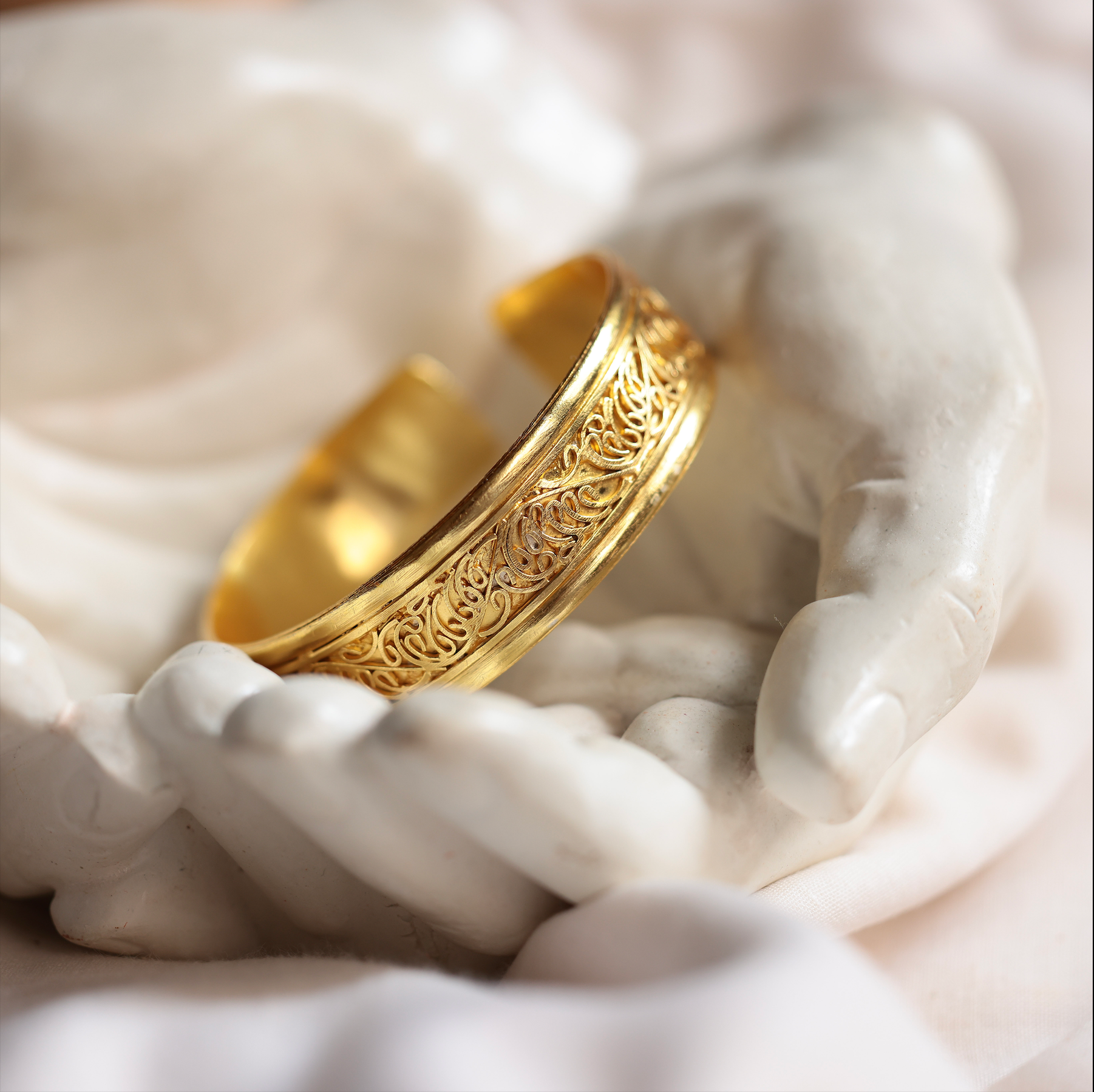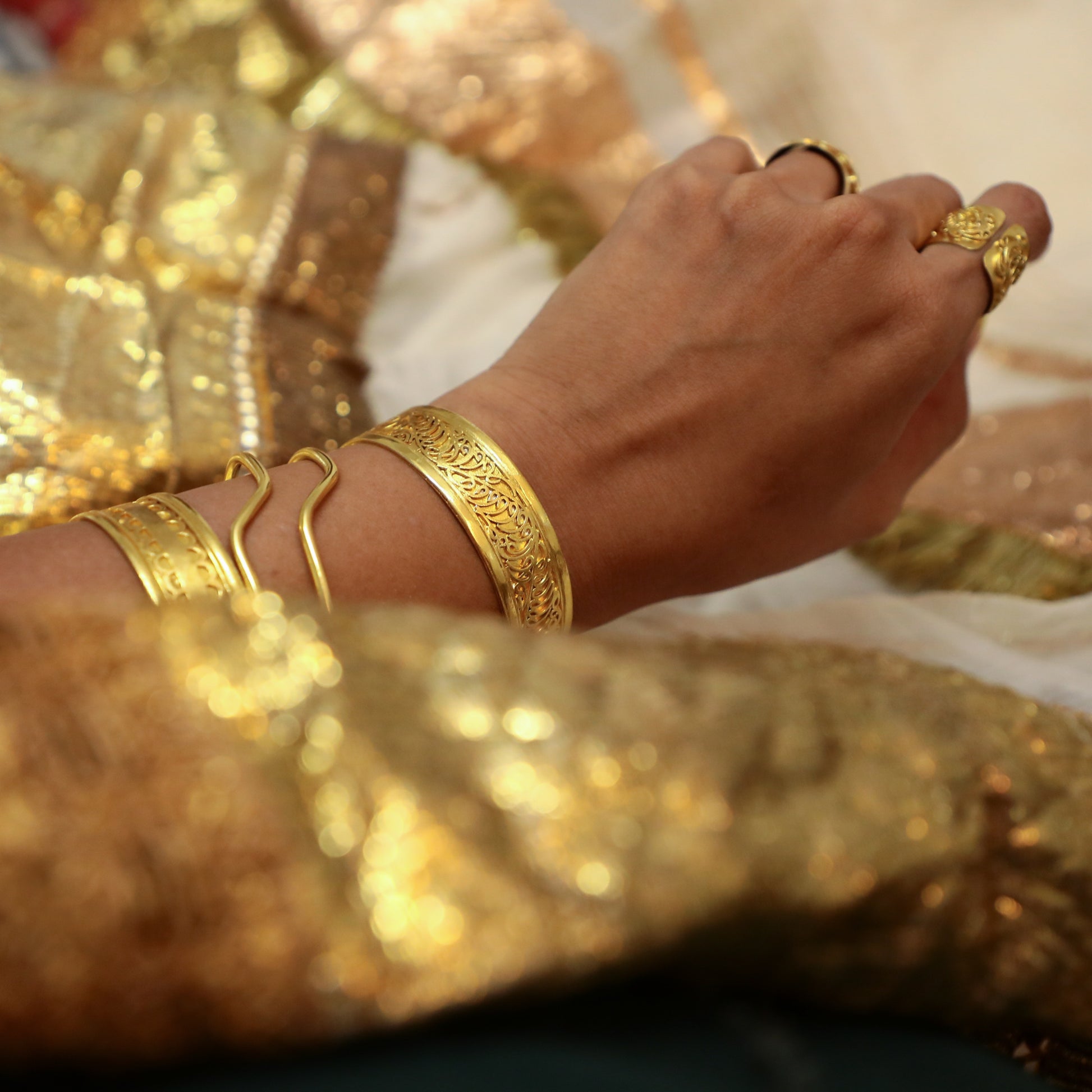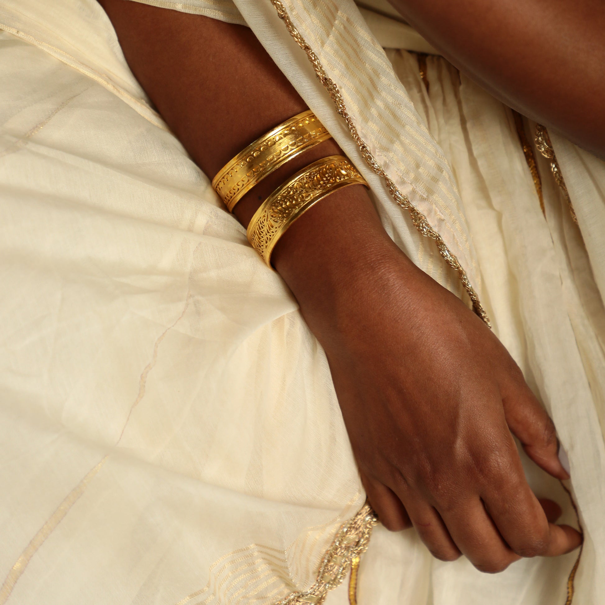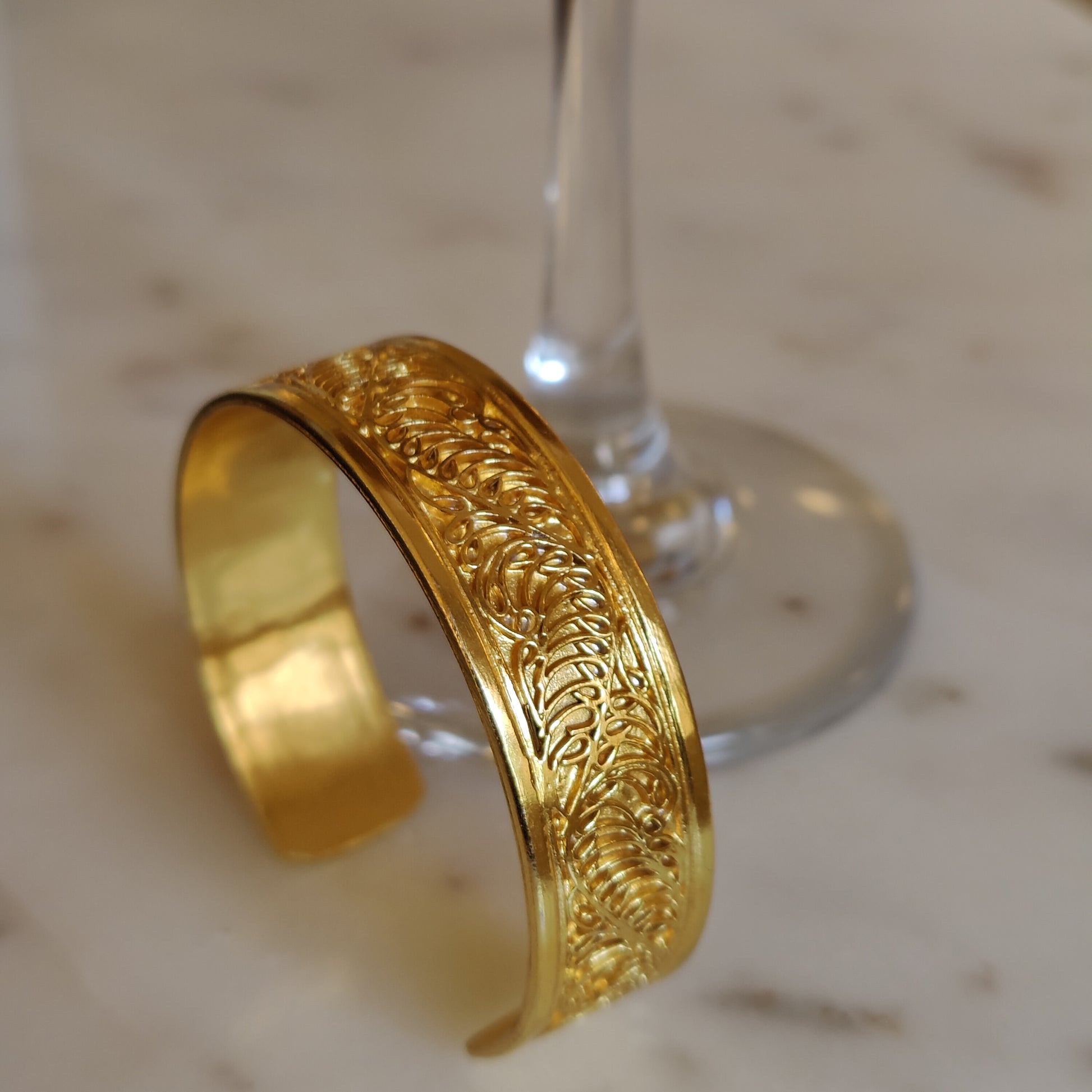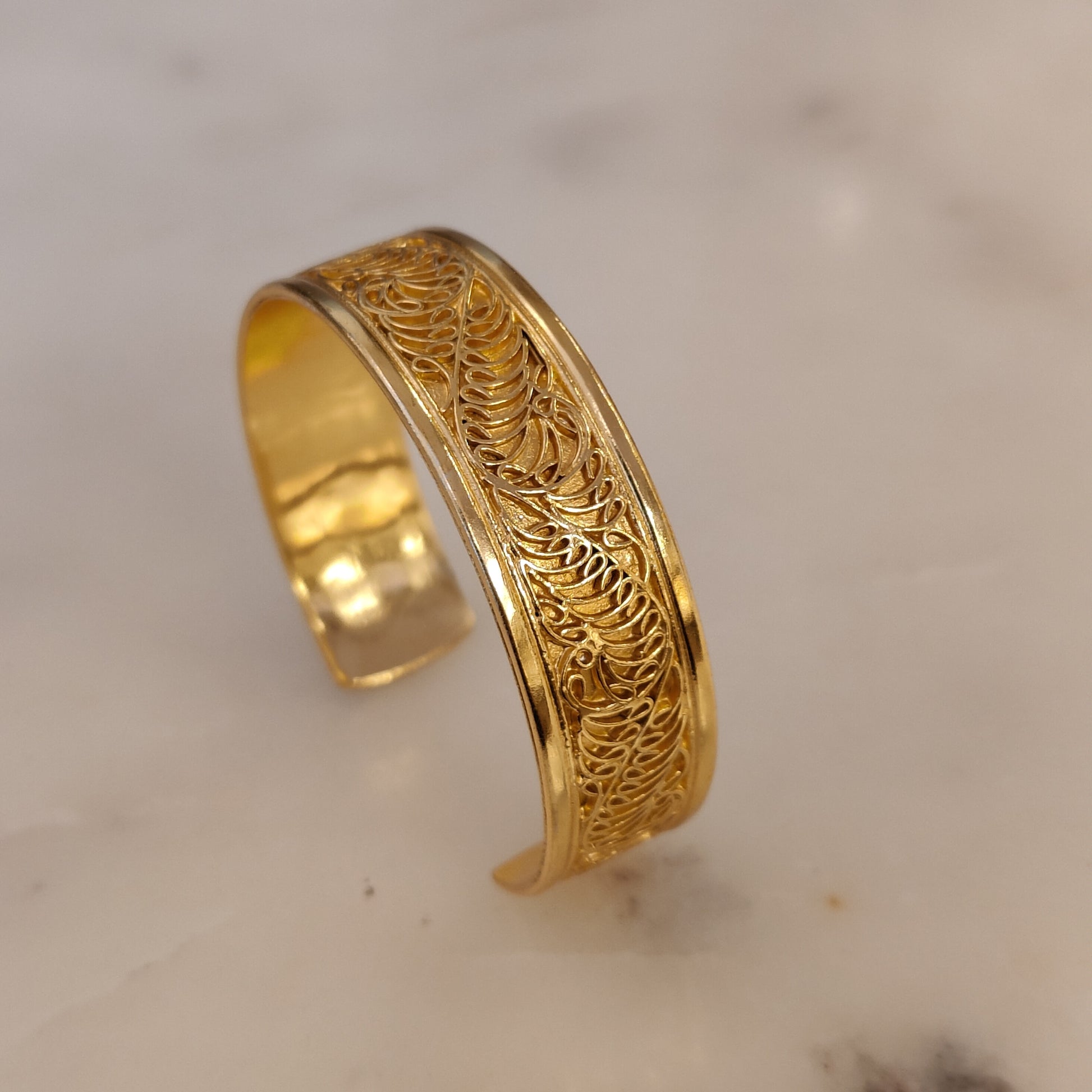 Gold plated brass cuff with from our Laila Collection. Intricately carved brass wires form a stunning design.