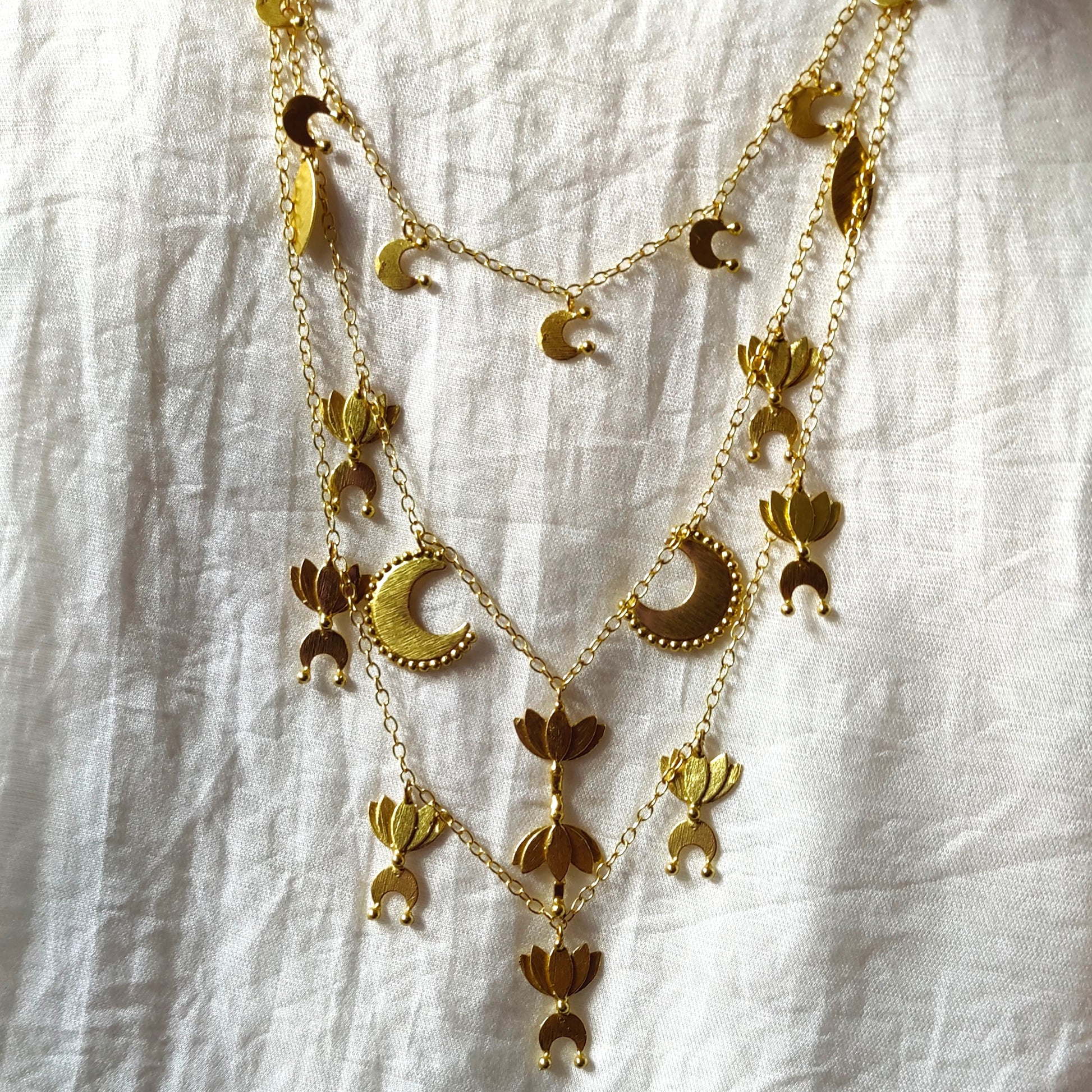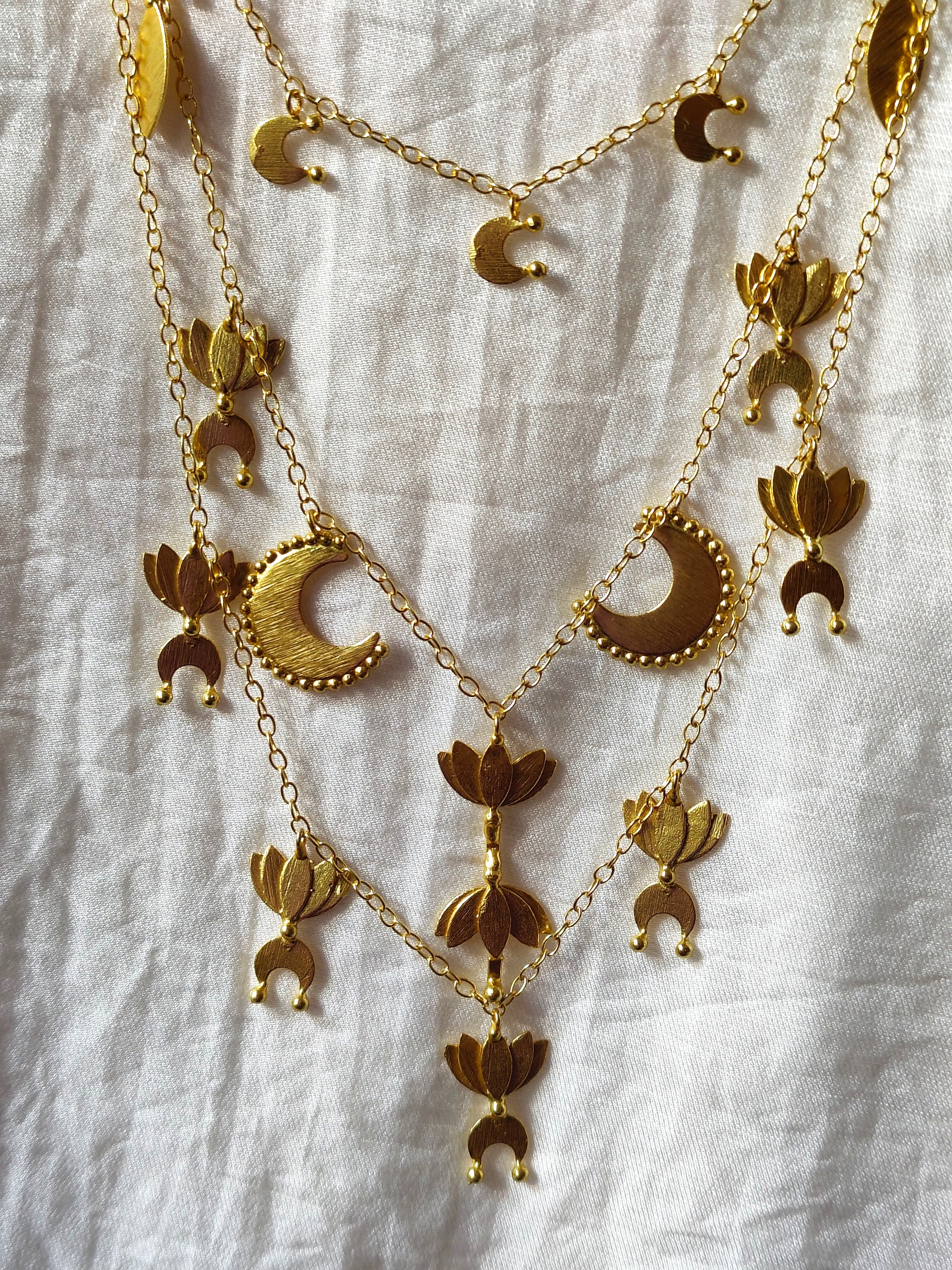 A definite must add to your necklace collection. The Parvati necklace is one of our most popular pieces when it comes to statement wear. This unique and bold beauty is adorned by large crescent moon and Som Kamal charms, Luna charms, and is layered necklace that sits beautifully on your clavicle and several levels below. Get ready to draw attention from across the room and have many admirers gravitate towards you to get a closer look.