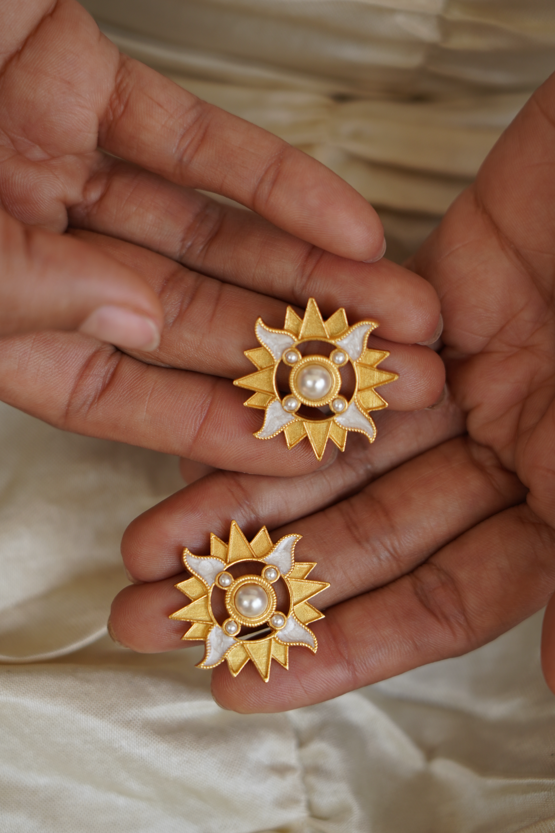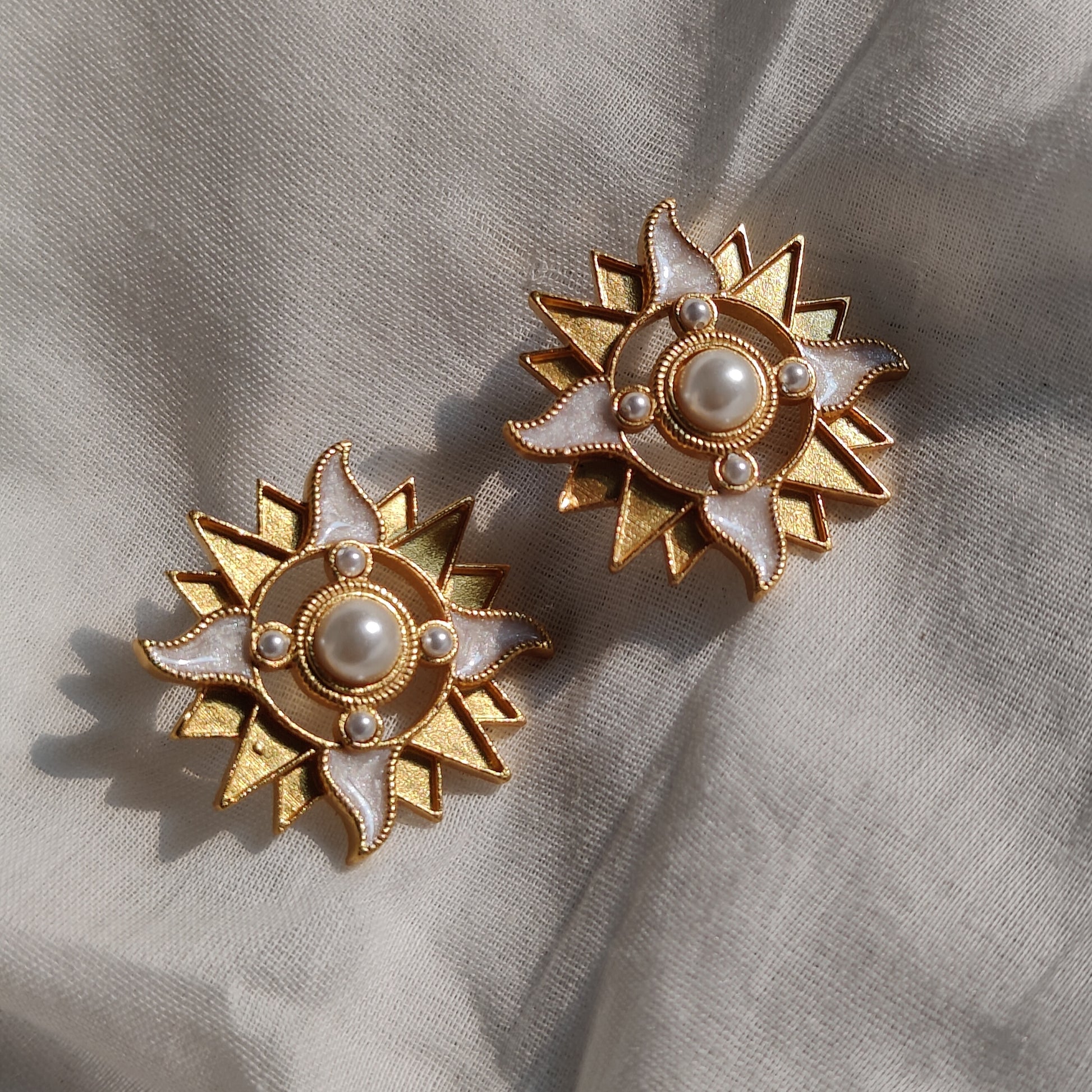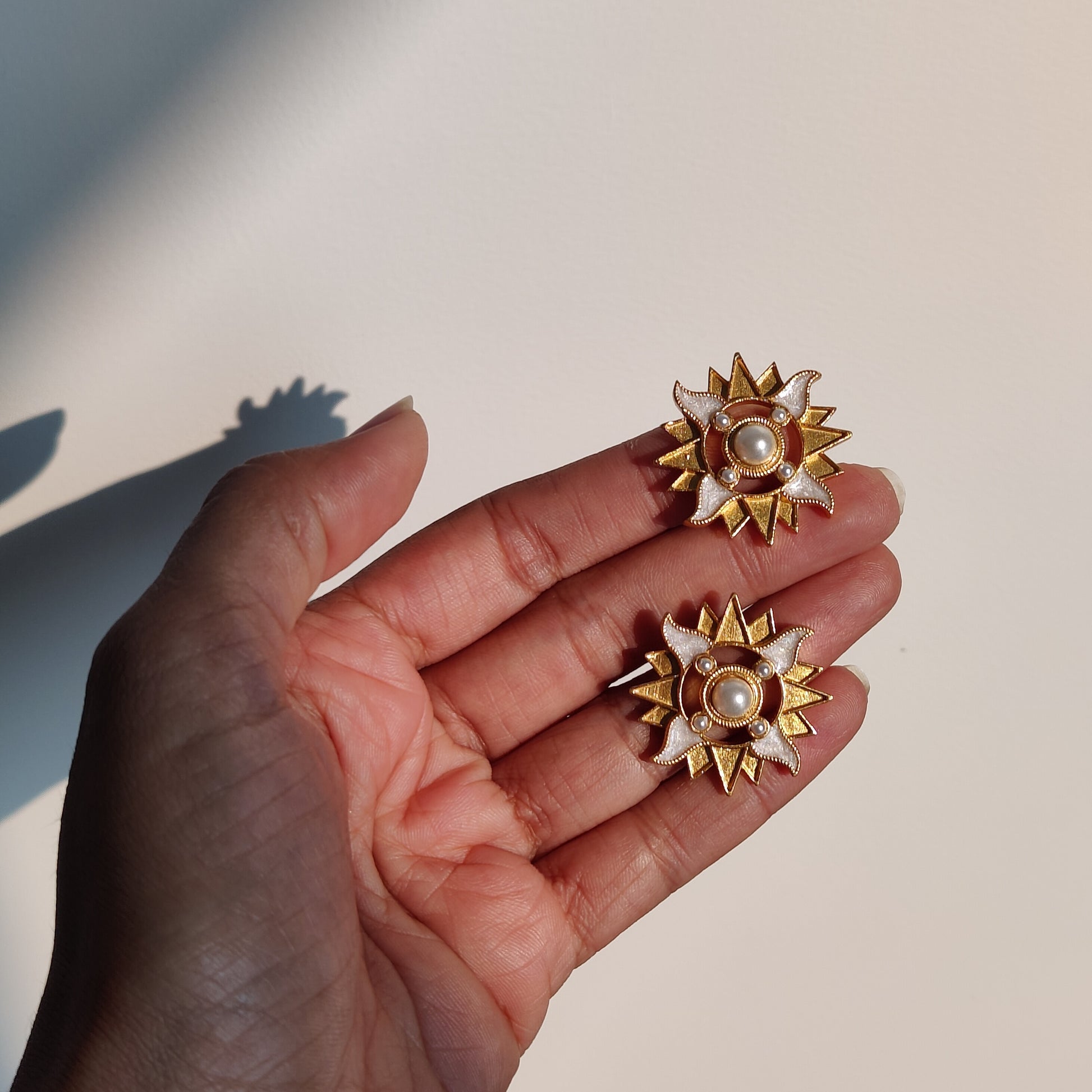 Symbolize light and positivity with these stunning Aabha Studs from our Vishwa Collection. Made with high-quality brass with a luxurious 18 carat gold plating, exquisite ivory enamel and glistening faux pearls add depth and dimension to this pair creating an alluring visual effect. Effortlessly elevate any outfit, whether it's a casual daytime look or a glamorous evening ensemble.