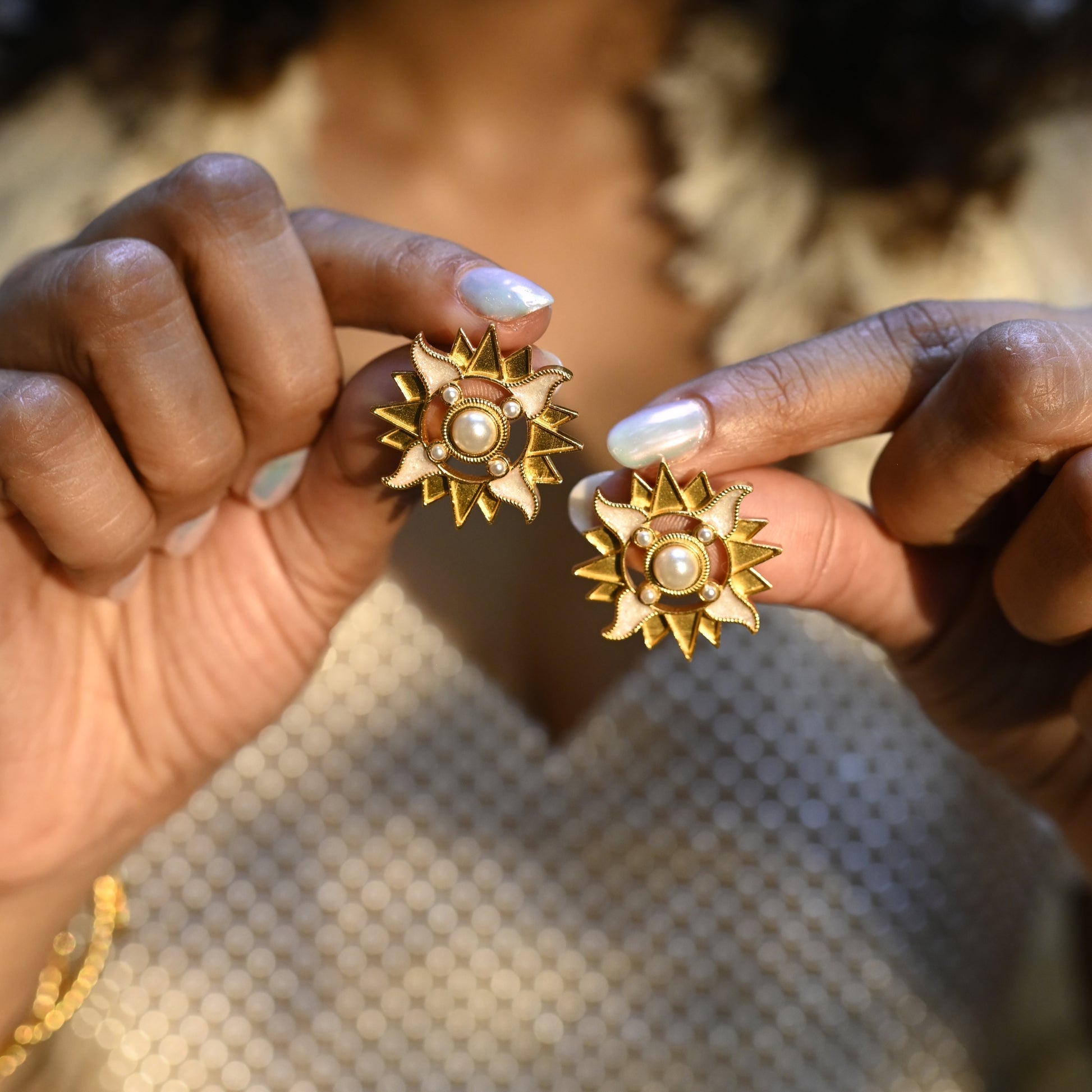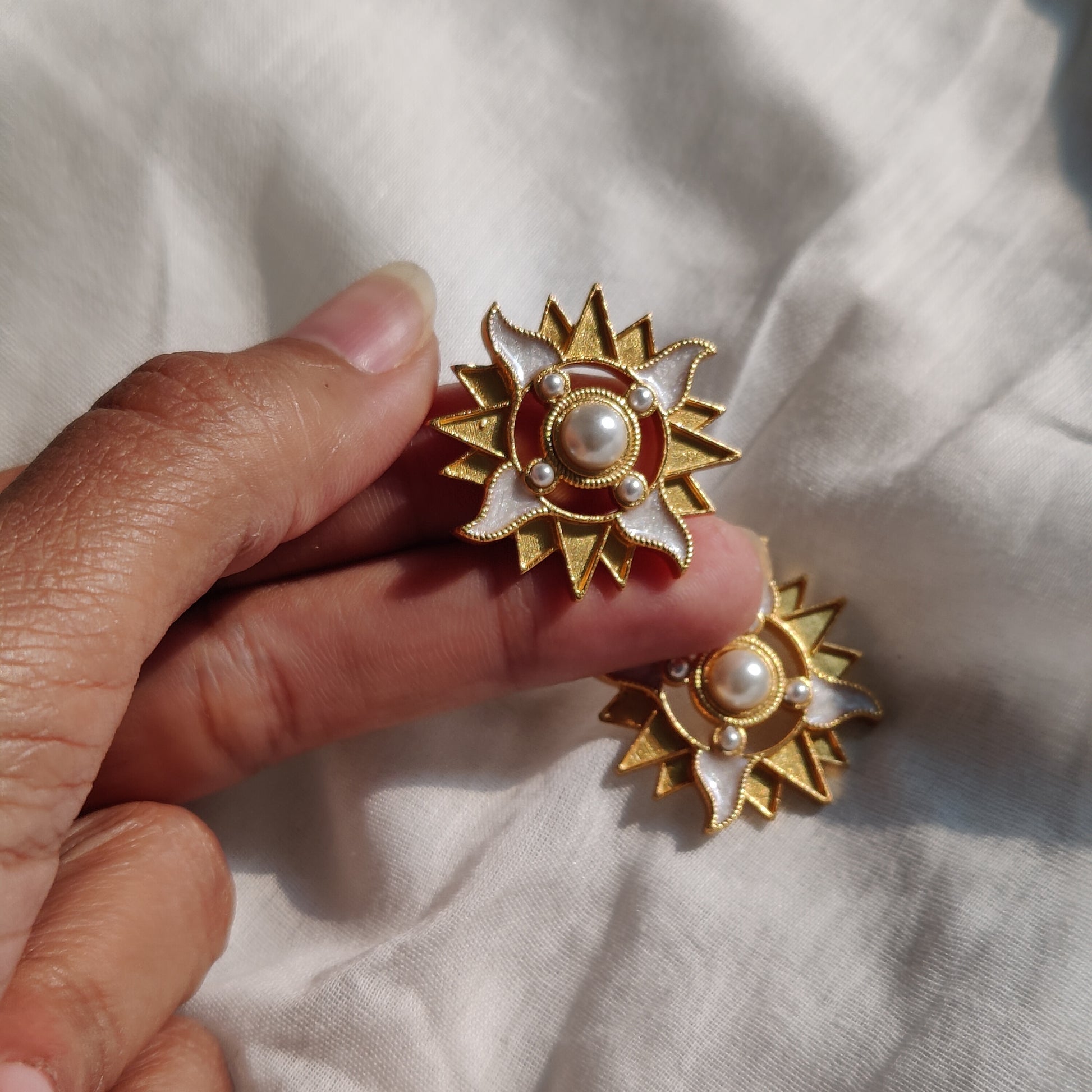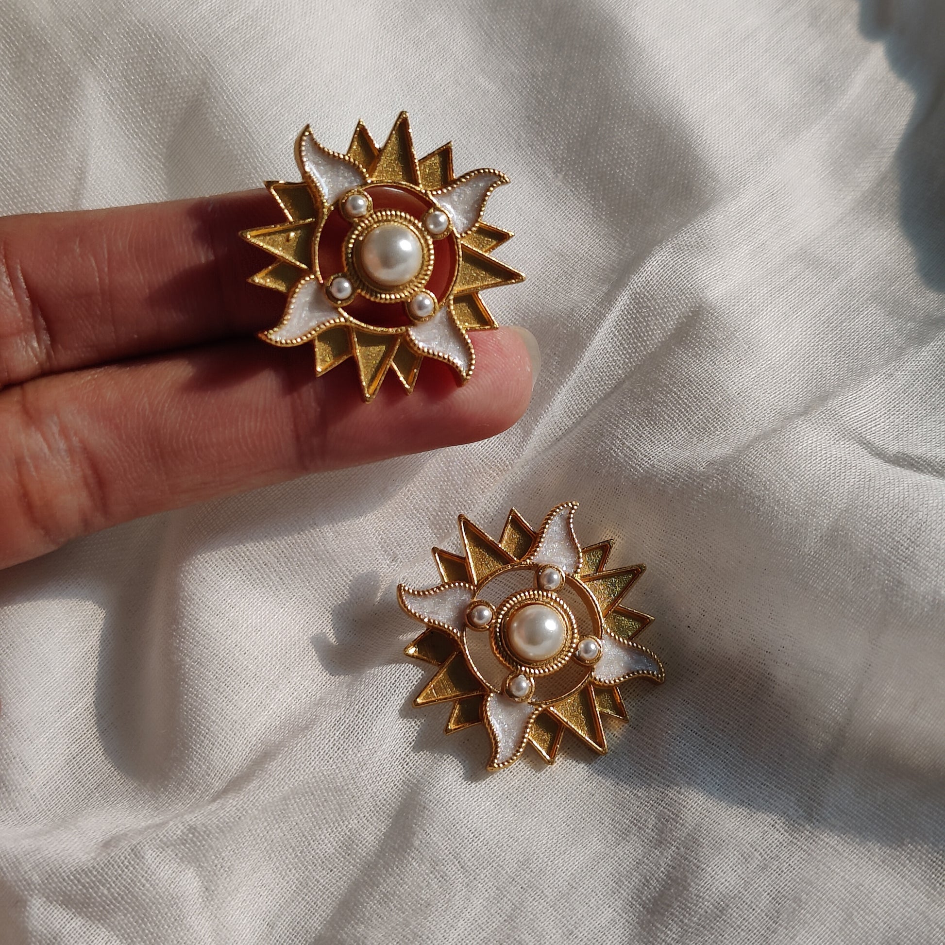 Symbolize light and positivity with these stunning Aabha Studs from our Vishwa Collection. Made with high-quality brass with a luxurious 18 carat gold plating, exquisite ivory enamel and glistening faux pearls add depth and dimension to this pair creating an alluring visual effect. Effortlessly elevate any outfit, whether it's a casual daytime look or a glamorous evening ensemble.