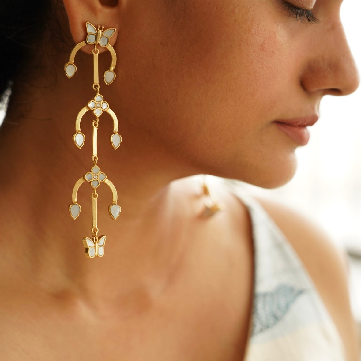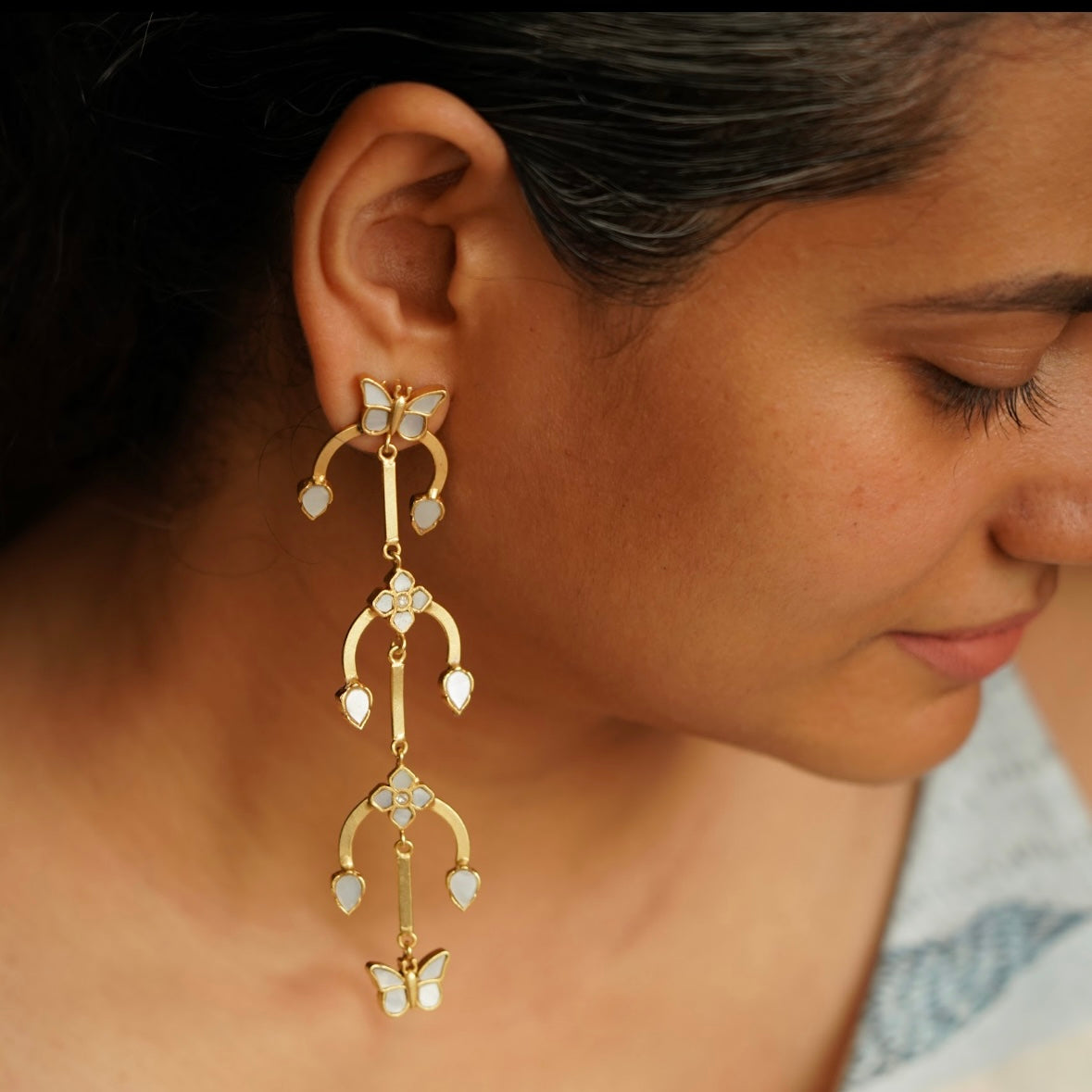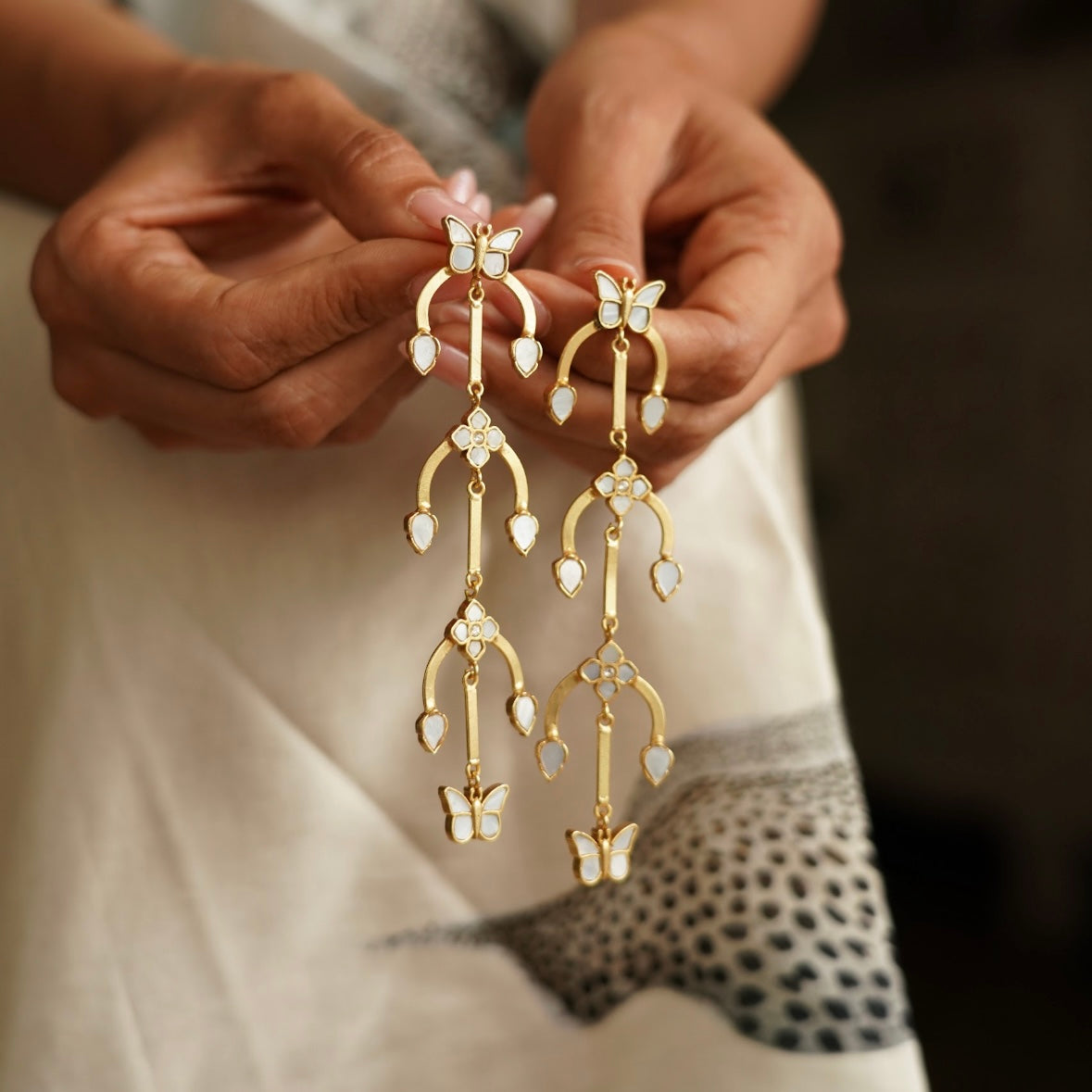 Delicately crafted Vine Earrings feature exquisite mother of pearl butterflies and flowers in a refined design. The luminous natural material catches light beautifully, creating subtle iridescence that complements any ensemble. These lightweight statement pieces offer sophisticated elegance without overwhelming your look.