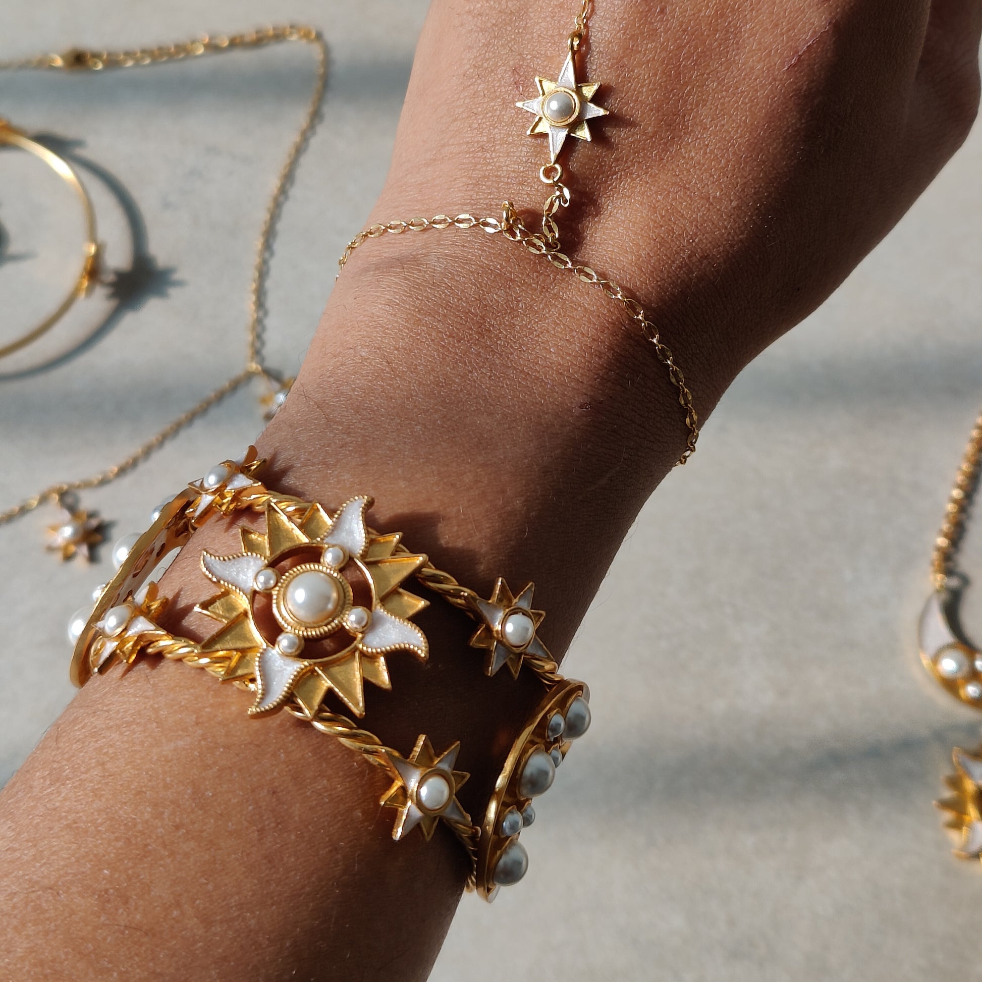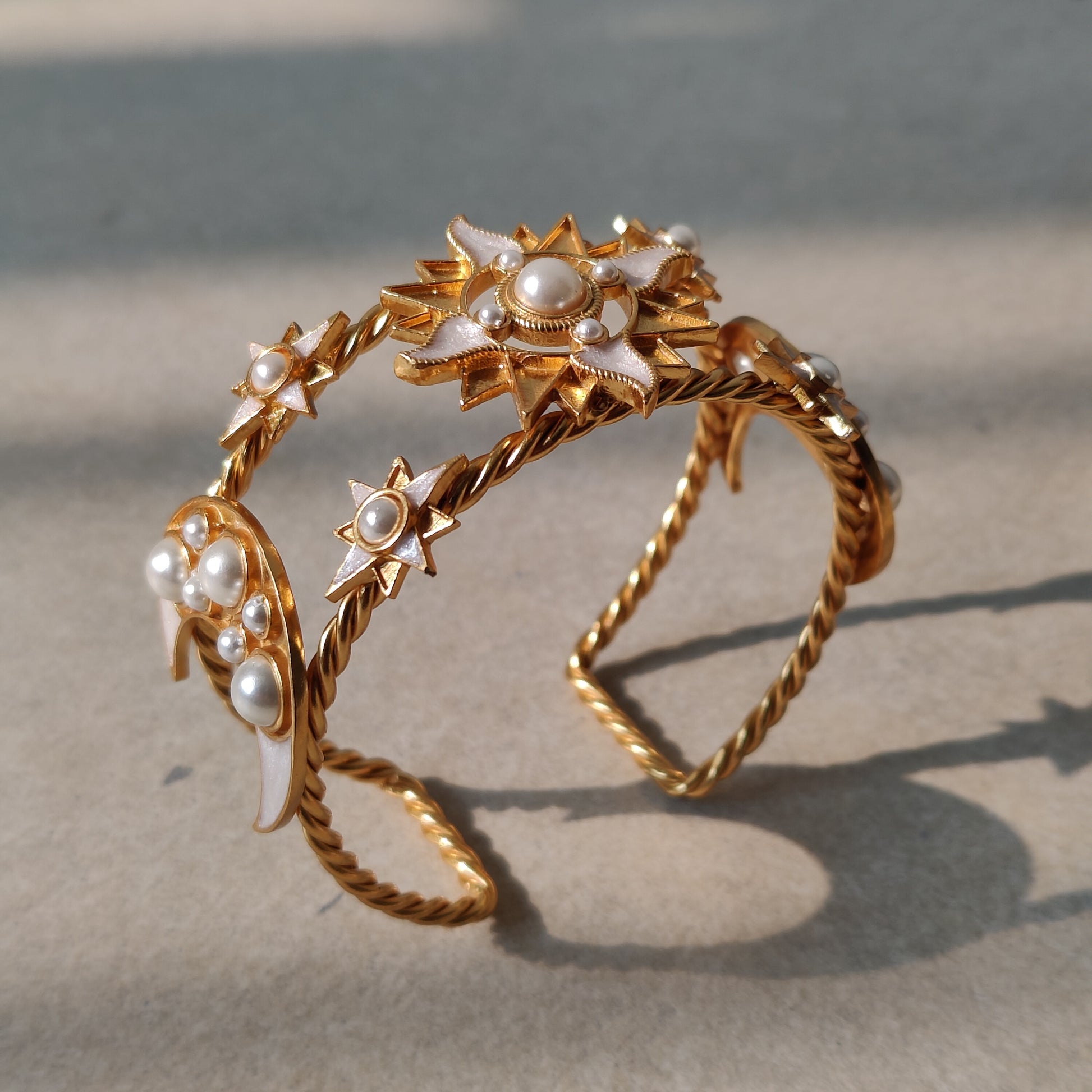 Embodying the serenity and mystique of the universe, our Vishwa Statement Cuff is all things elegance and grace. Adorned with surya, chandra and choti tara, this dual band expandable statement cuff reflects the universe’s gentle radiance and captures the eye of everyone you come across. The mesmerizing blend of ivory enamel, faux pearls and 18 carat gold plating makes this piece a must have for all those festive occasions coming up.